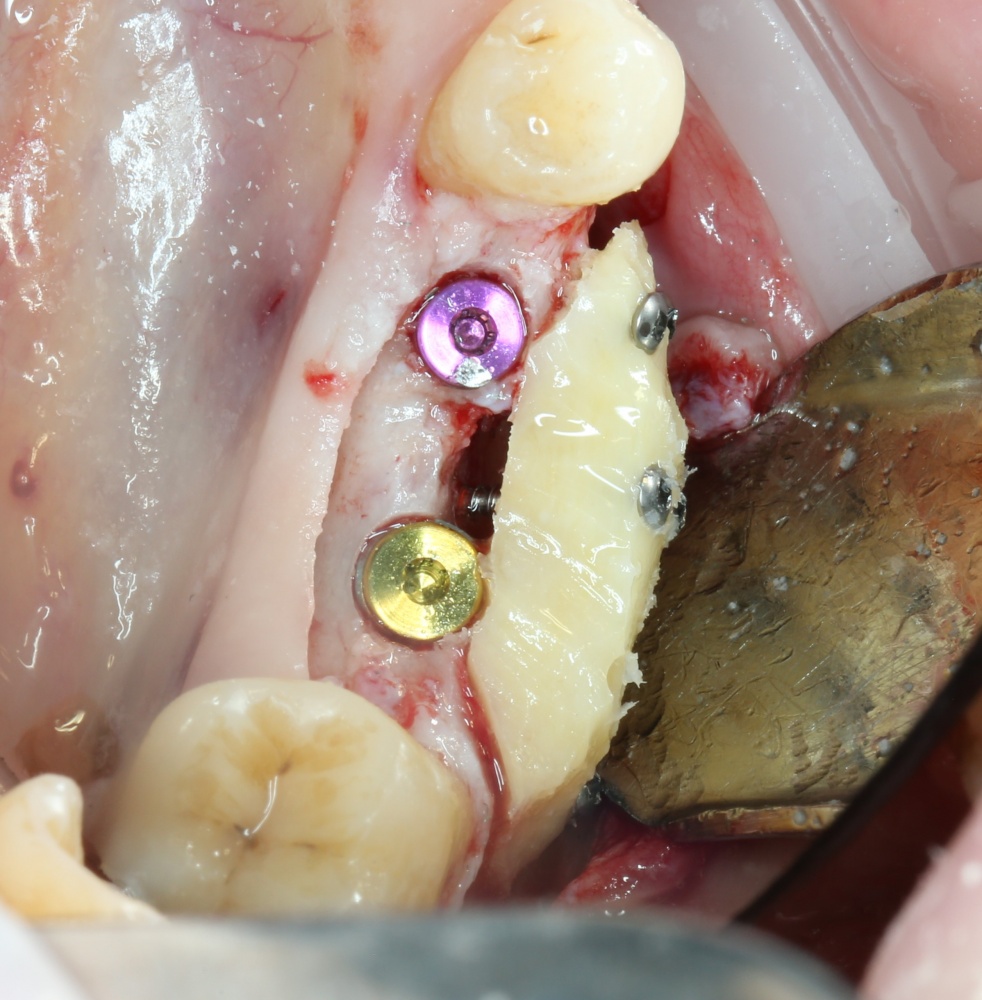 Для этого стоит использовать длинные винты. В противном случае, при подготовке лунки под имплантат костный блок может отлететь.