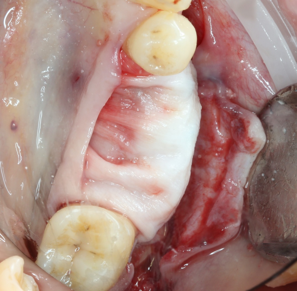 - Между блоком и принимающим ложем есть пустое пространство. Поэтому область операции необходимо изолировать барьерной мембраной от быстро растущих мягких тканей. Я использую Geistlich BioGide 25×25 mm: