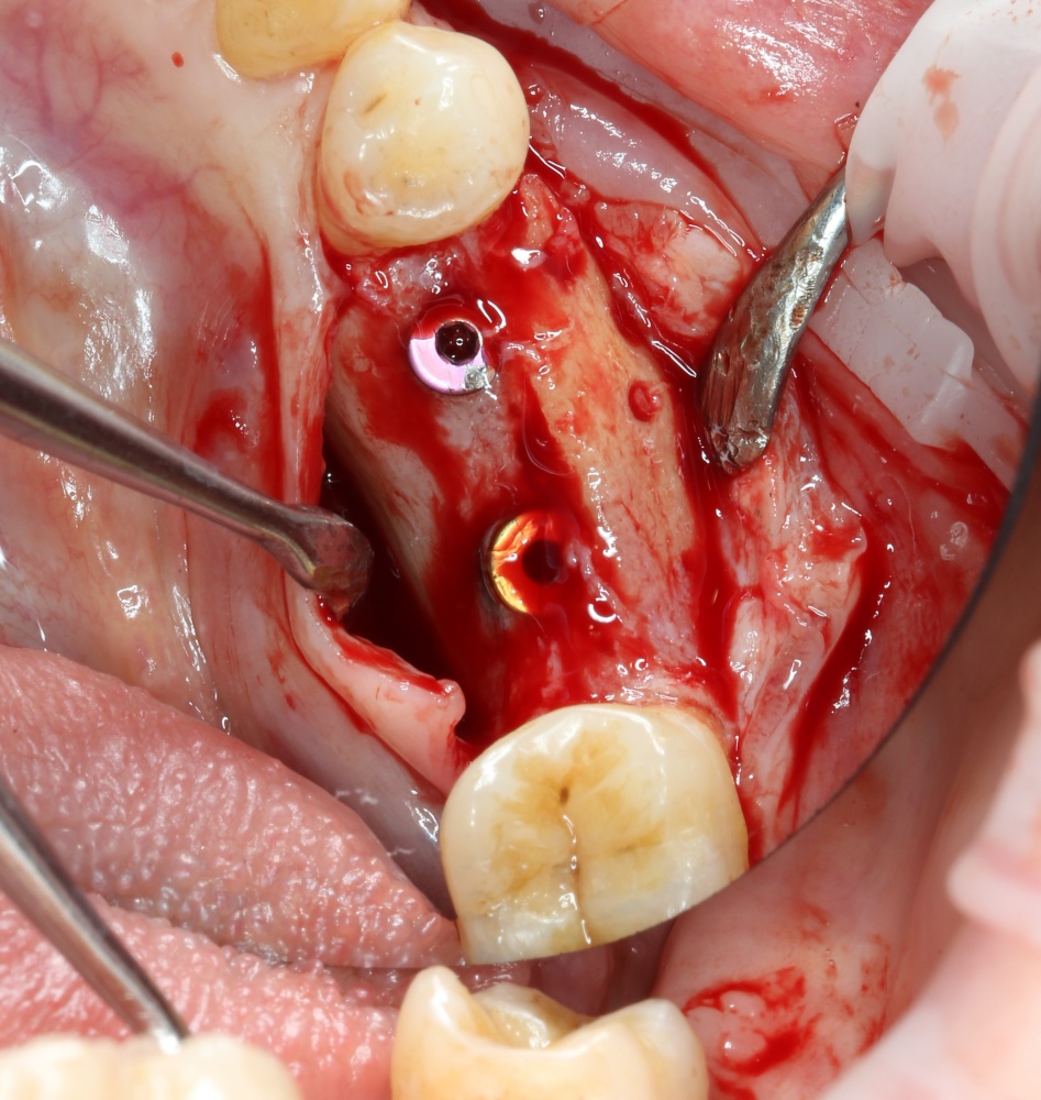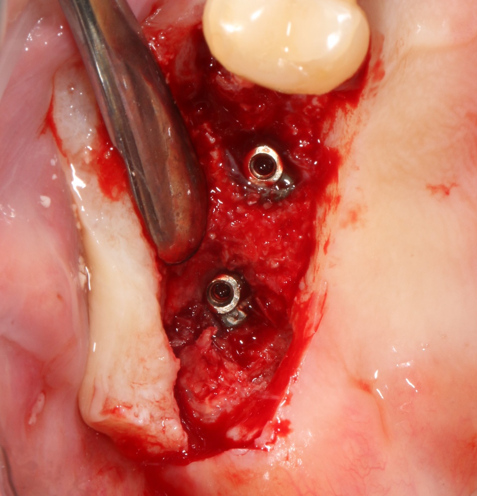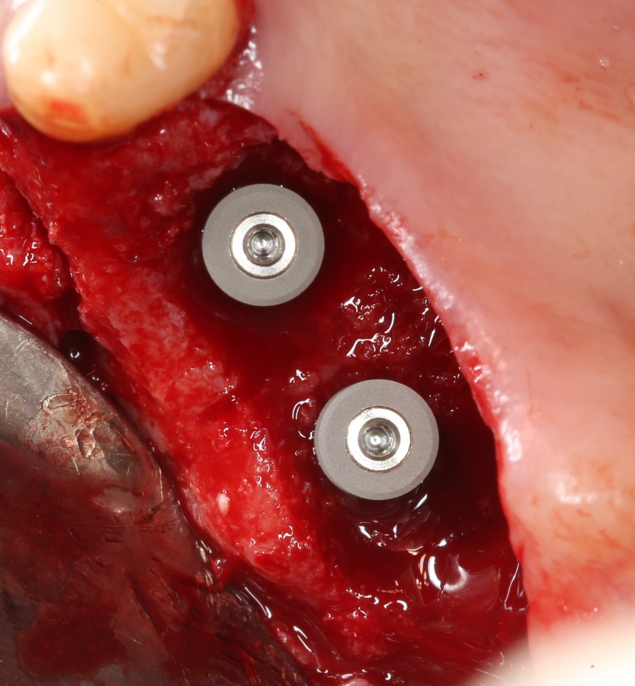 Практически, для проведения операции имплантации одновременно с остеопластикой можно использовать любые импланты. Однако, работа с имплантами, имеющими плоскую ортопедическую платформу (такие, как XiVE Dentsply Implants), несколько сложнее, чем с имплантами, имеющими конический ортопедический интерфейс. Для проведения НКР еще удобнее субкрестальные импланты (к примеру, Ankylos Dentsply Implants), поскольку можно не париться с позиционированием по высоте и просто «утопить» импланты целиком в графт: