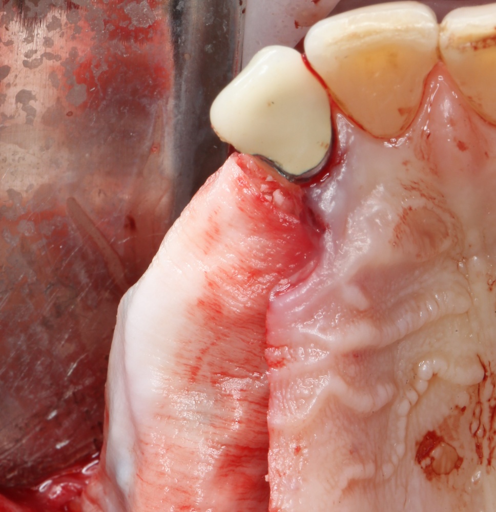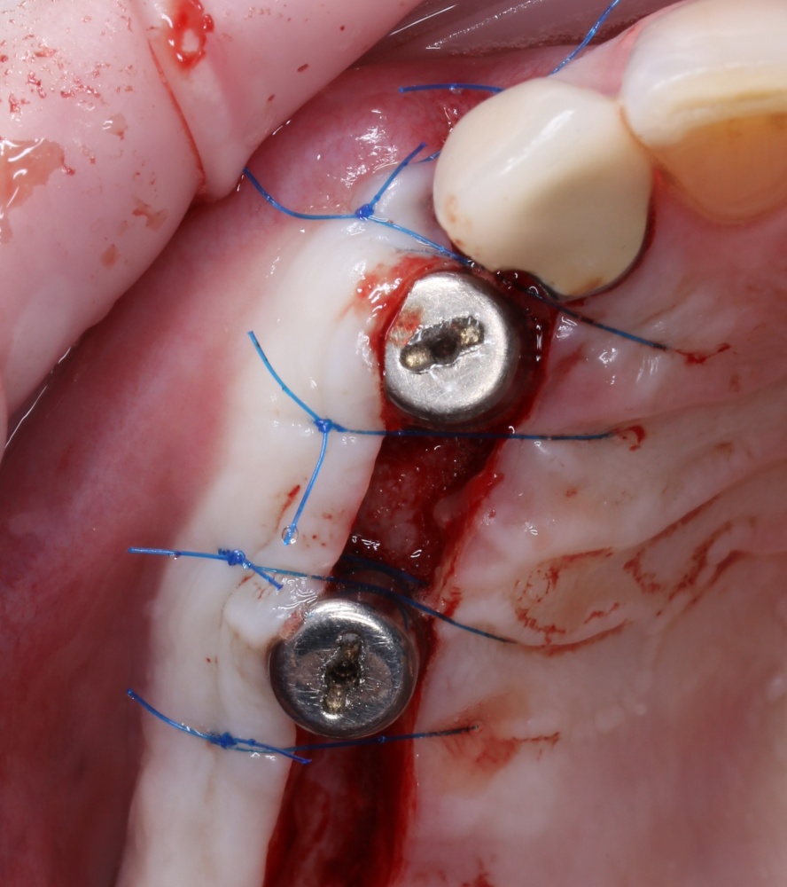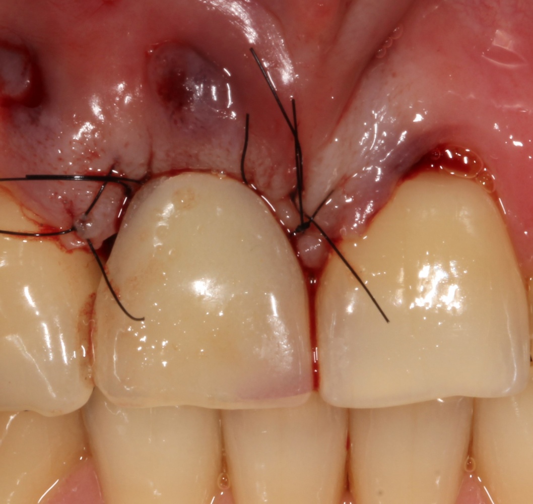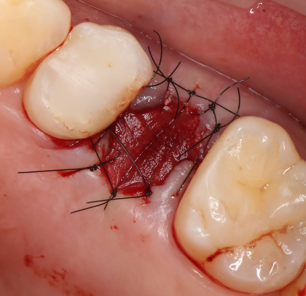Совсем уж стягивать края раны не нужно (если бы мы использовали обычный Bio-Oss, то это было бы необходимо). Отличие Bio-Oss Collagen еще и в том, что он не размывается при кровотечении.