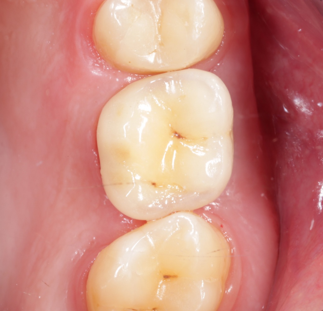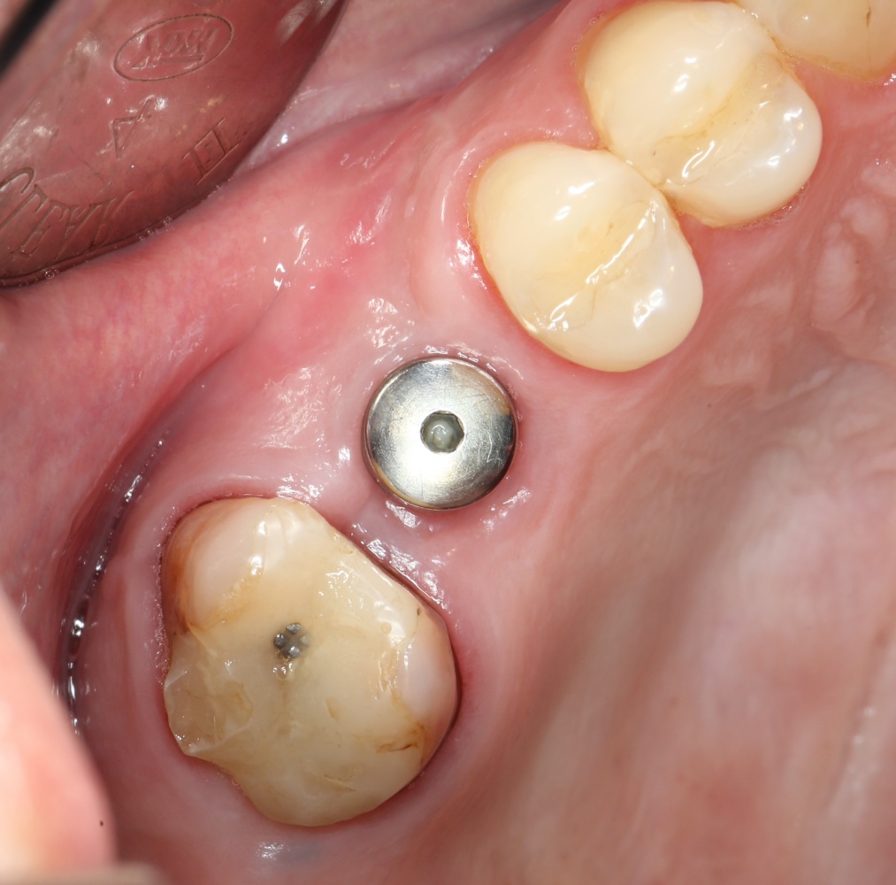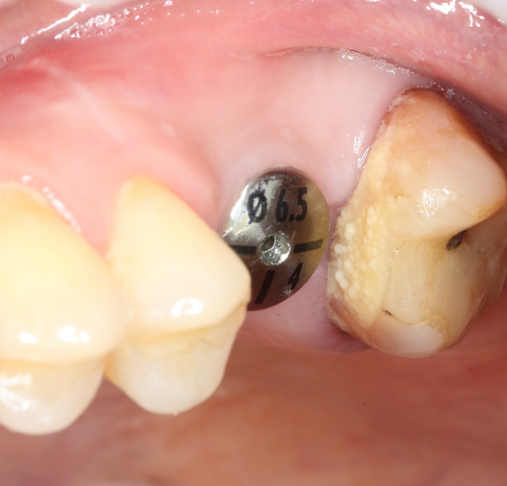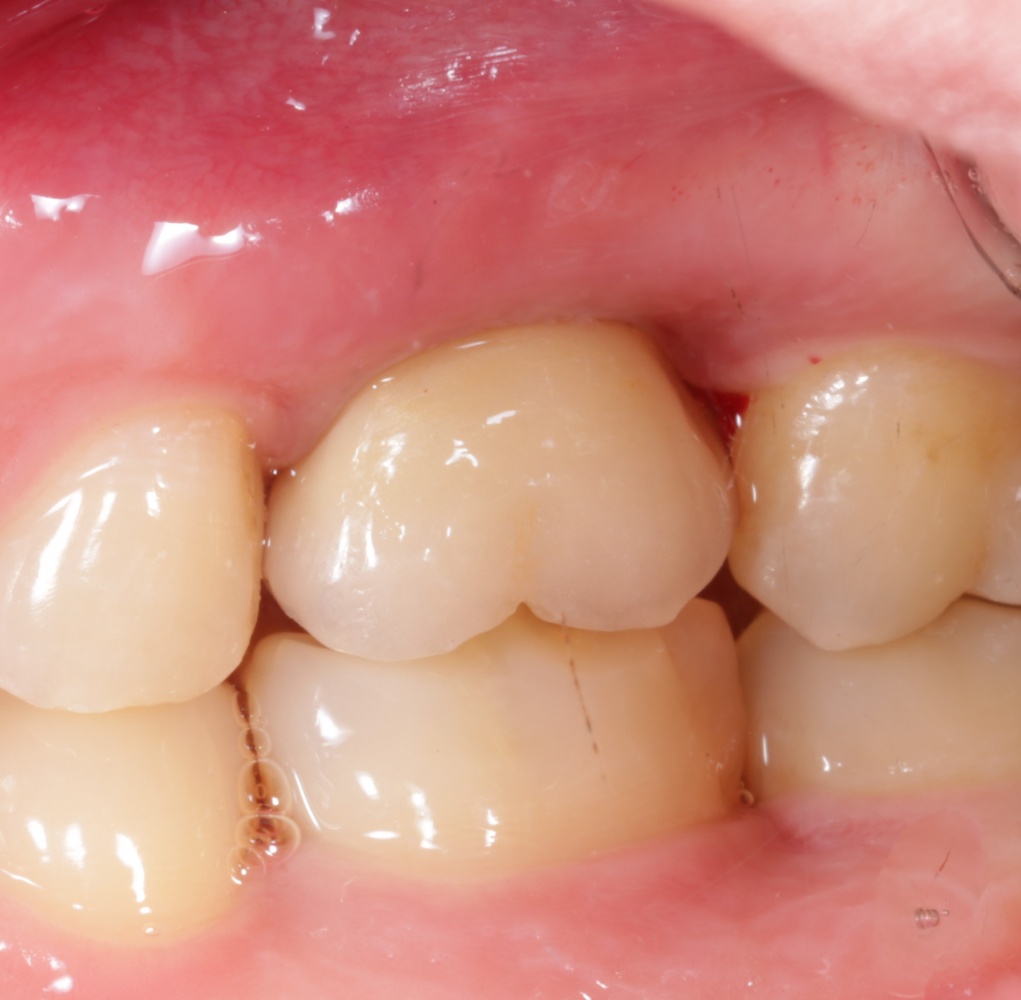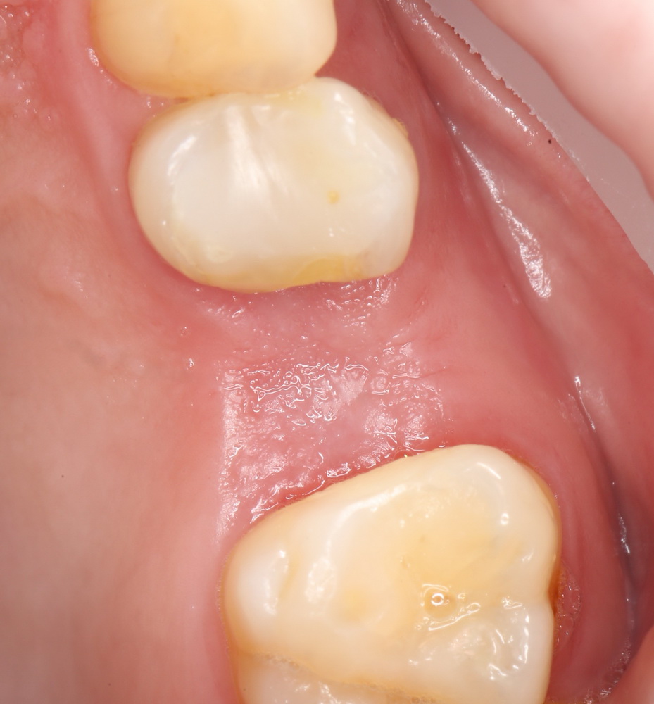 Не только фронтальная группа зубов требует внимания с точки зрения эстетики — некоторые пациенты хотят, чтобы и в боковом участке «зуб был неотличим от настоящего». И в этих случаях мы также используем биоматериалы, чтобы сохранить на месте костные стенки лунки и получить хороший эстетический и функциональный результат: