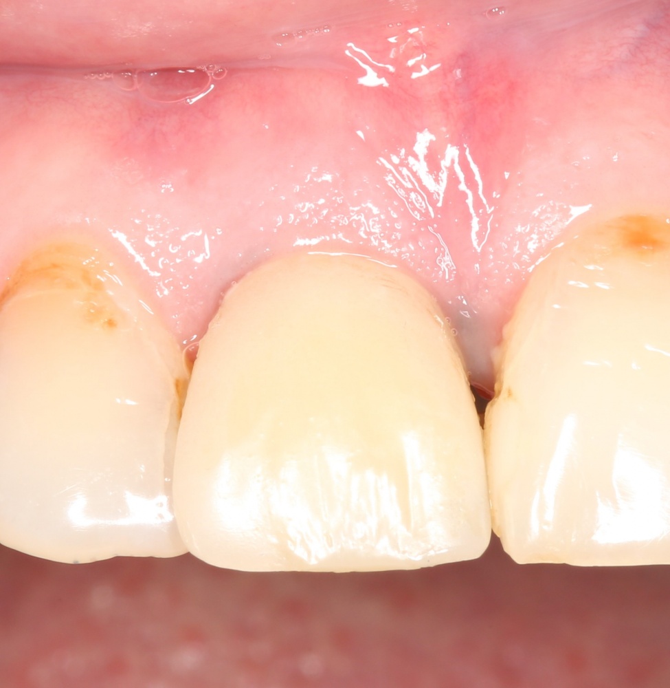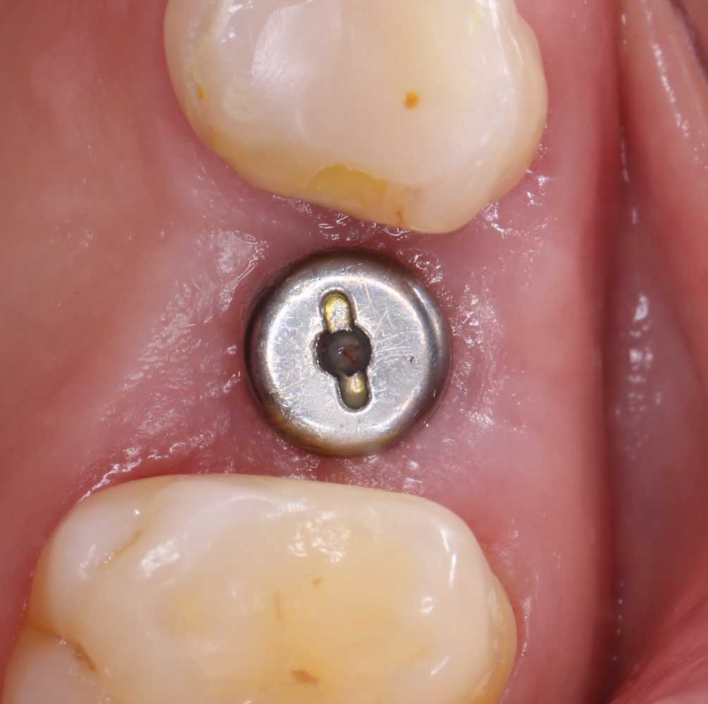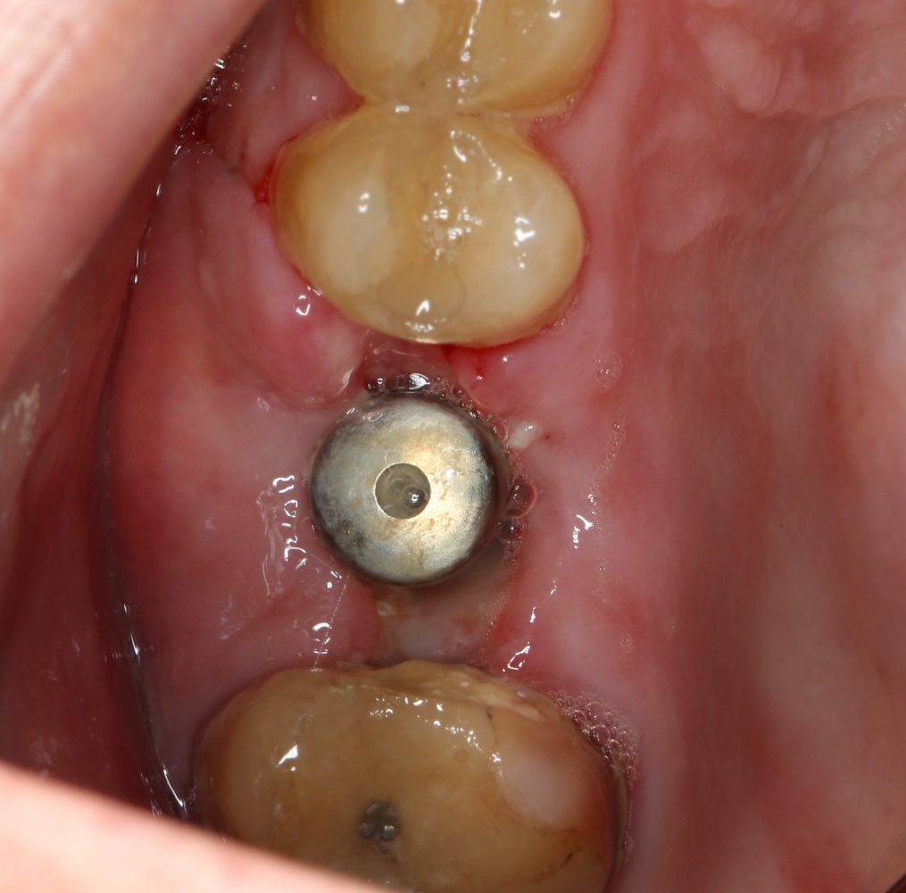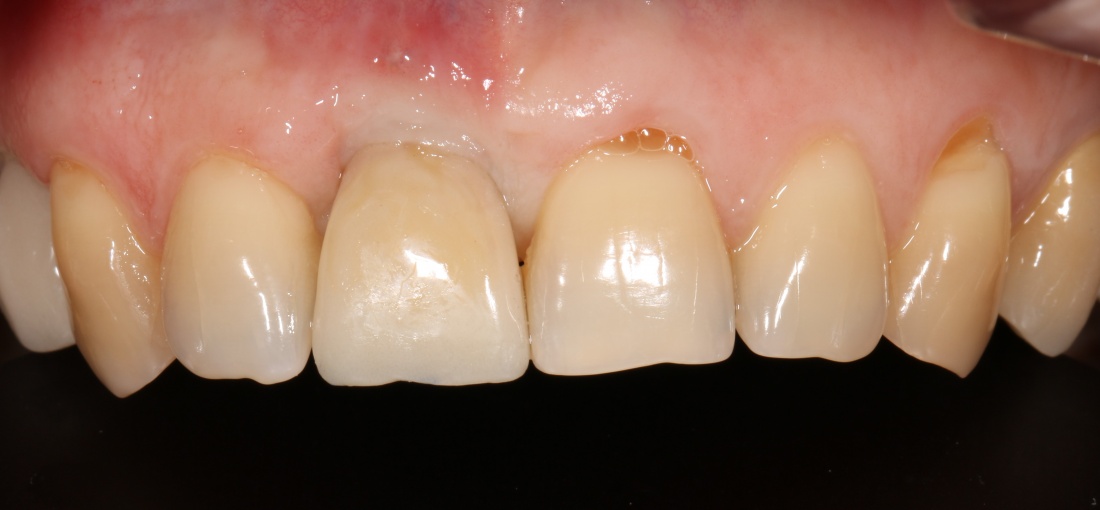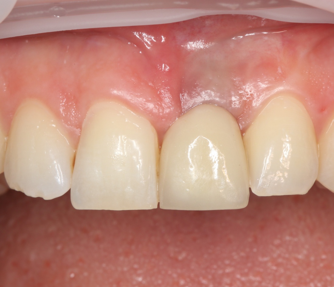 Могли бы мы в этом случае обойтись без аугментации лунки? Вполне, могли бы. Но в этом случае окружающие коронку ткани выглядели бы иначе, а сам пациент испытывал бы проблемы с уходом — из-за утраты объемов, у него постоянно застревали бы остатки пищи между коронкой и десной.