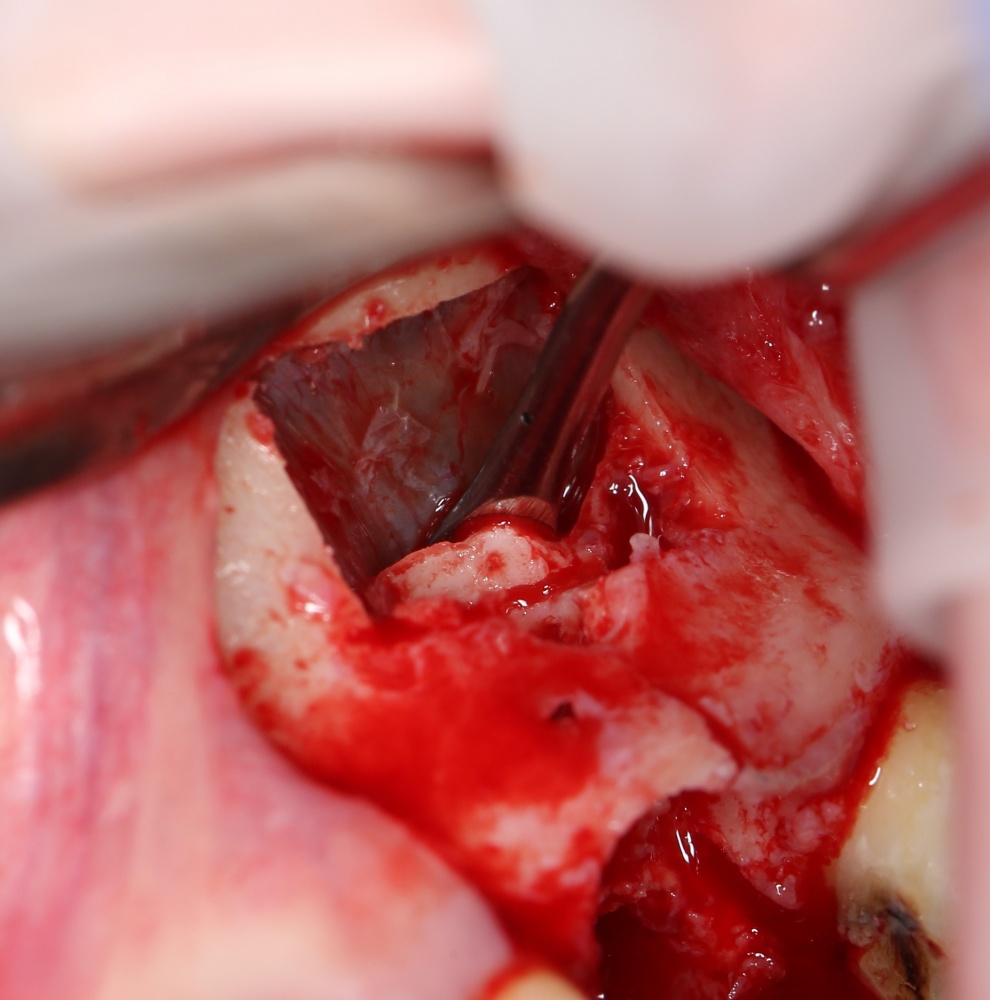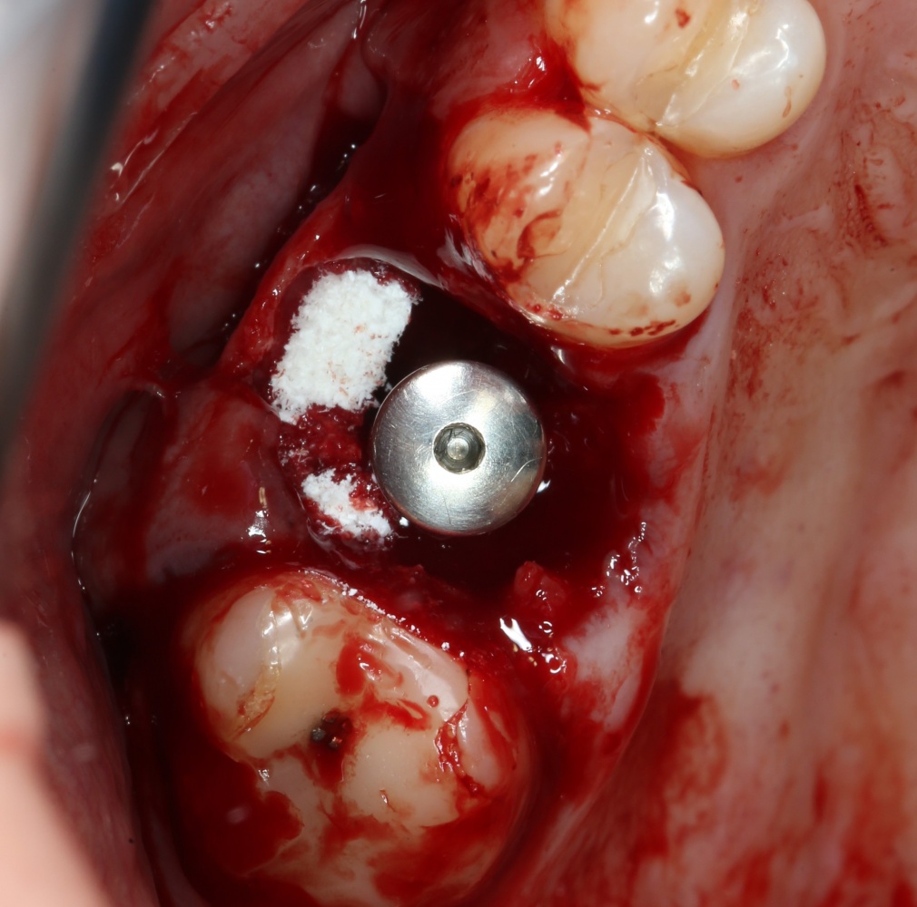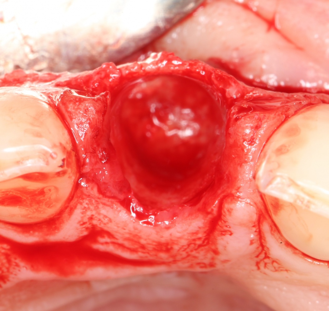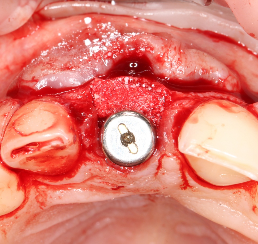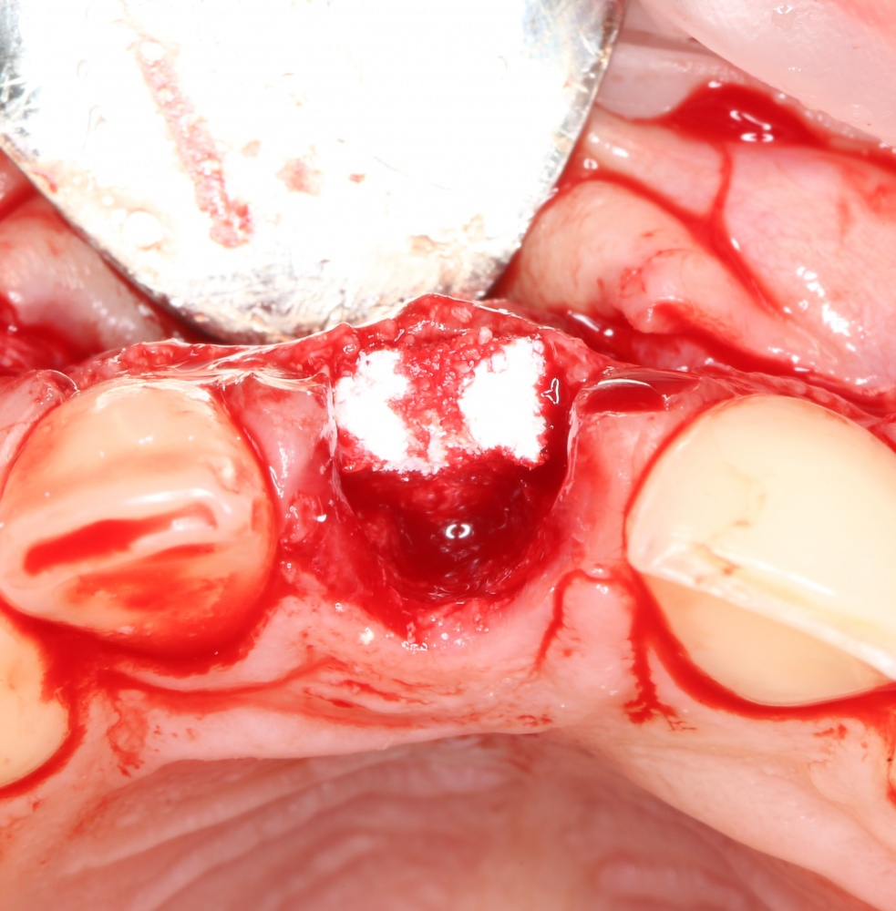 Вот, собственно, и всё. Далее, наш биоматериал ведет себя совершенно также, как и обычный Bio-Oss — он быстро пропитывается кровью и отлично удерживается на месте: