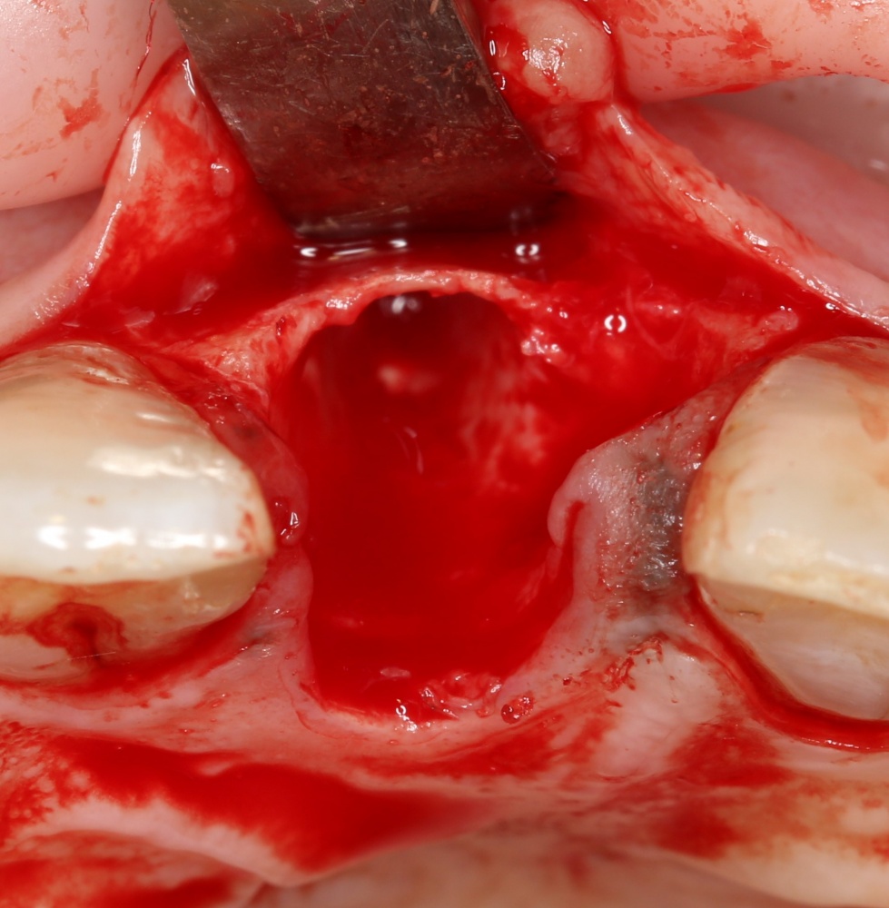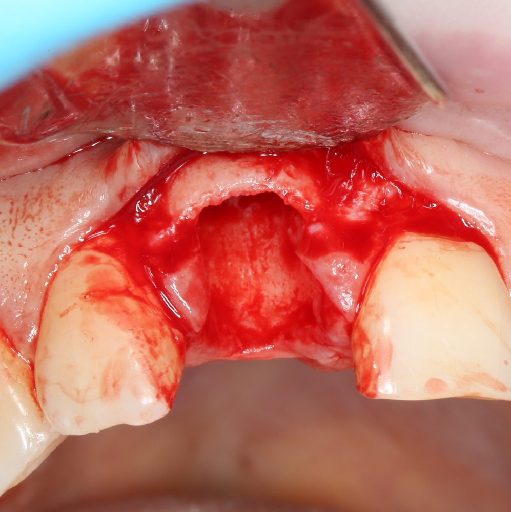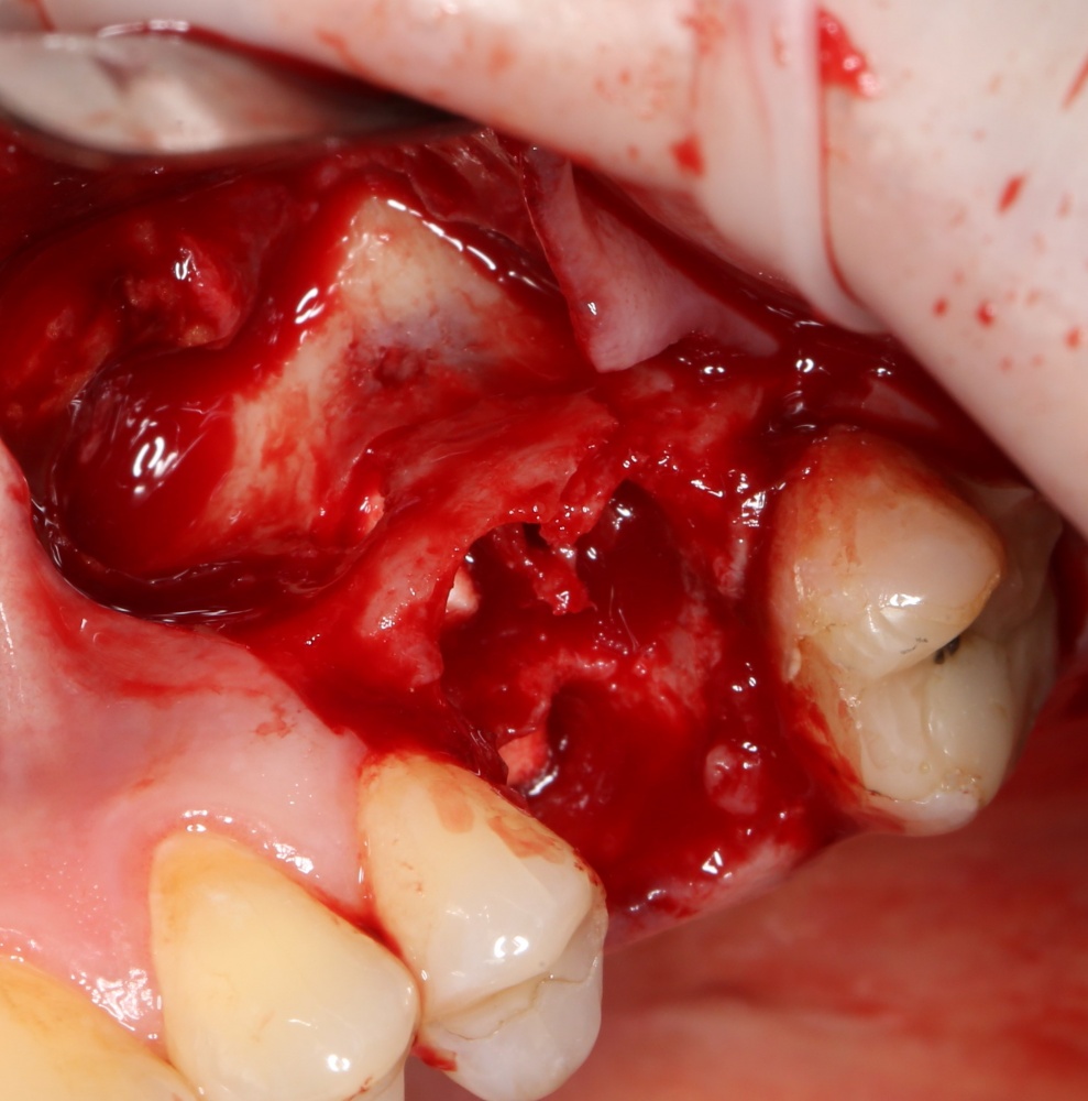После удаления зуба и сопутствующей гранулемы, остается большая по размеру лунка с тонкой и поврежденной воспалительным процессом вестибулярной стенкой: