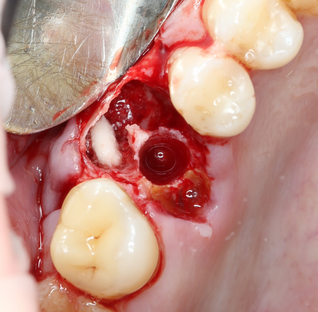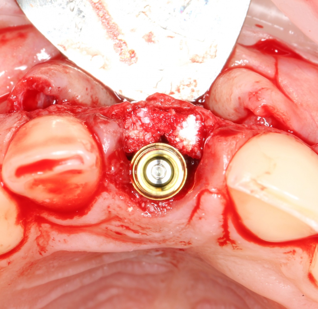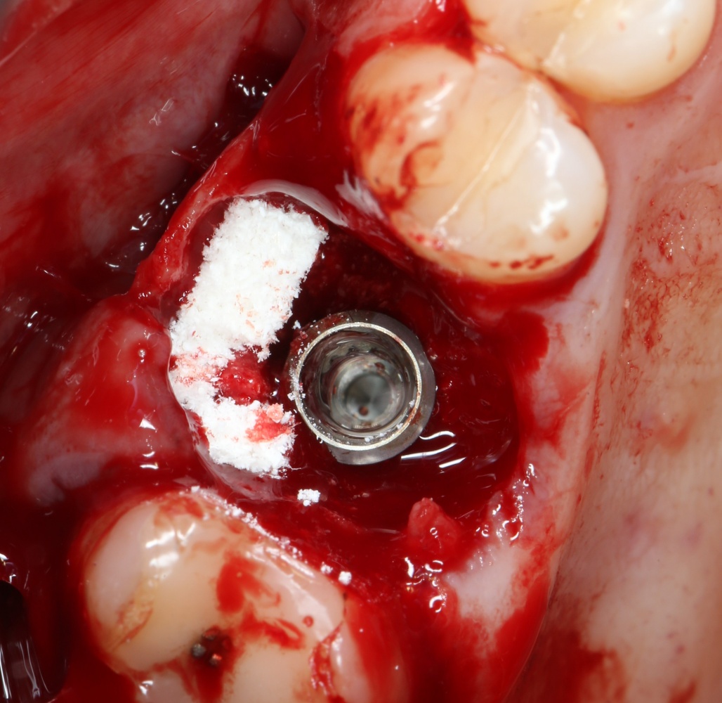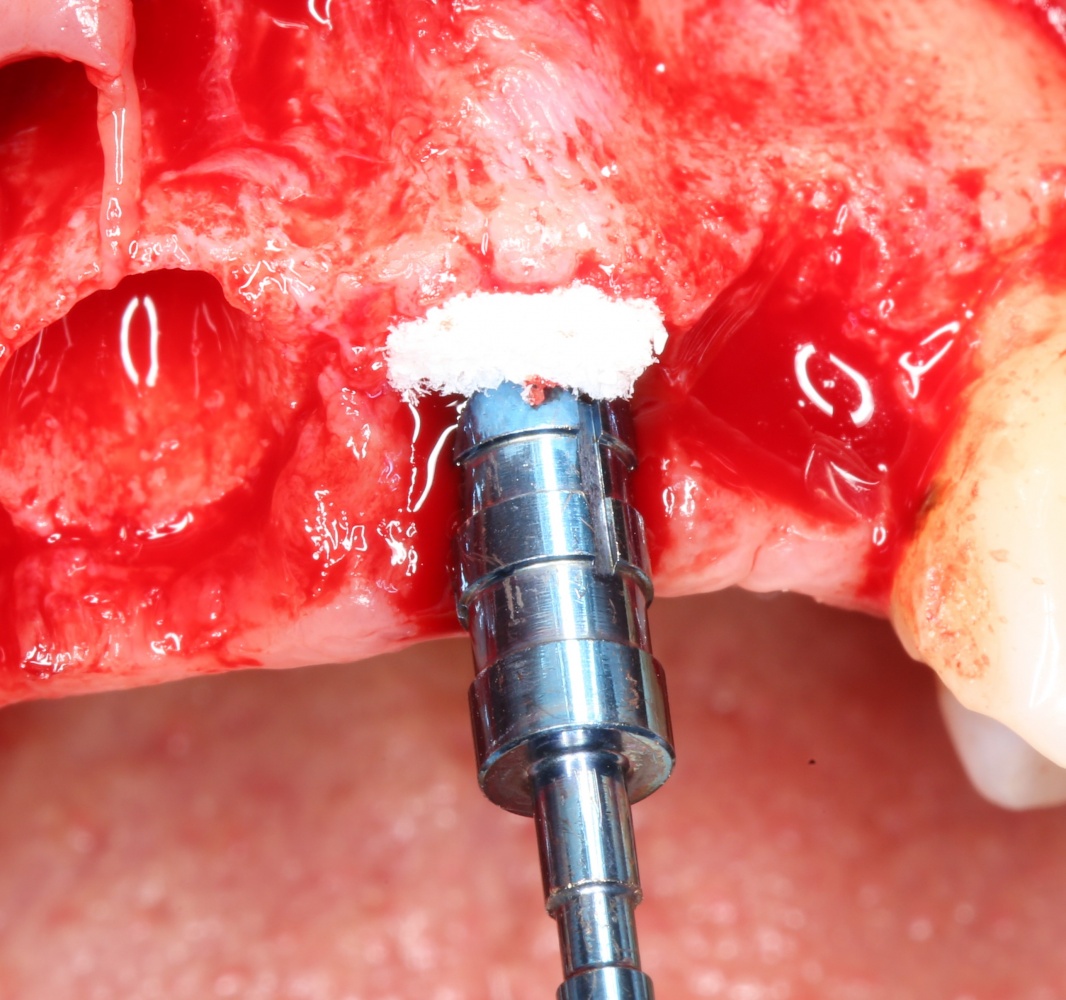 Поэтому у нас возникает вопрос заполнения «пустого» пространства между вестибулярной стенкой лунки и поверхностью импланта. И, как ни странно, с Bio-Oss Collagen это удобнее сделать до установки имплантата.