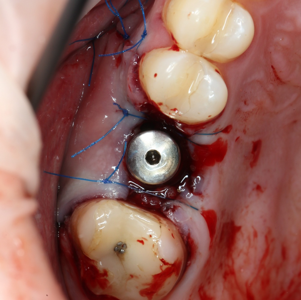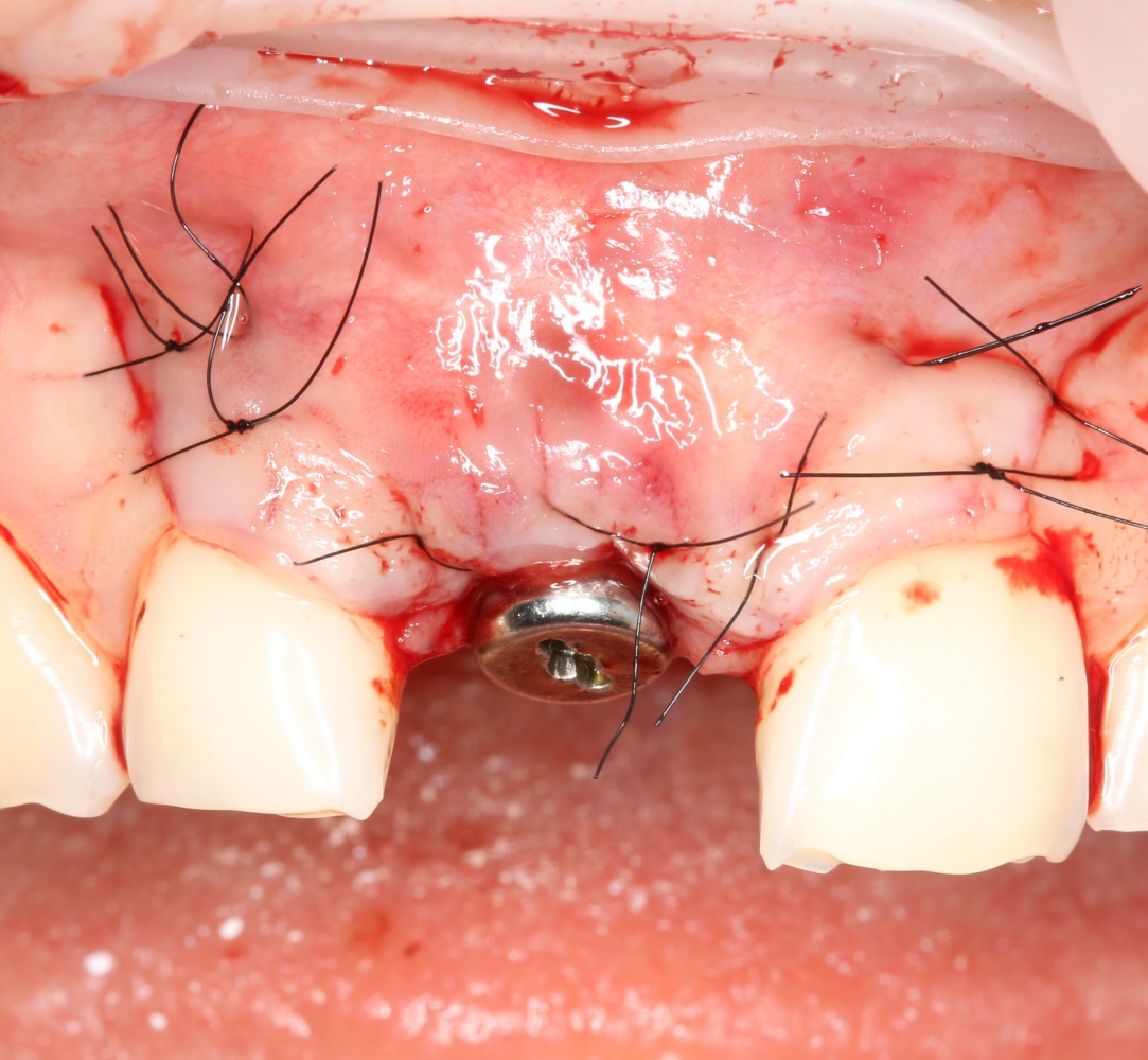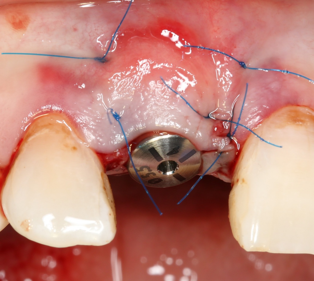 В данном случае мы планировали закончить этап немедленной установкой временной коронки, этим займется ортопед через полчаса после установки импланта. Пока же, я закрываю имплантат формирователем десны и накладываю швы:
