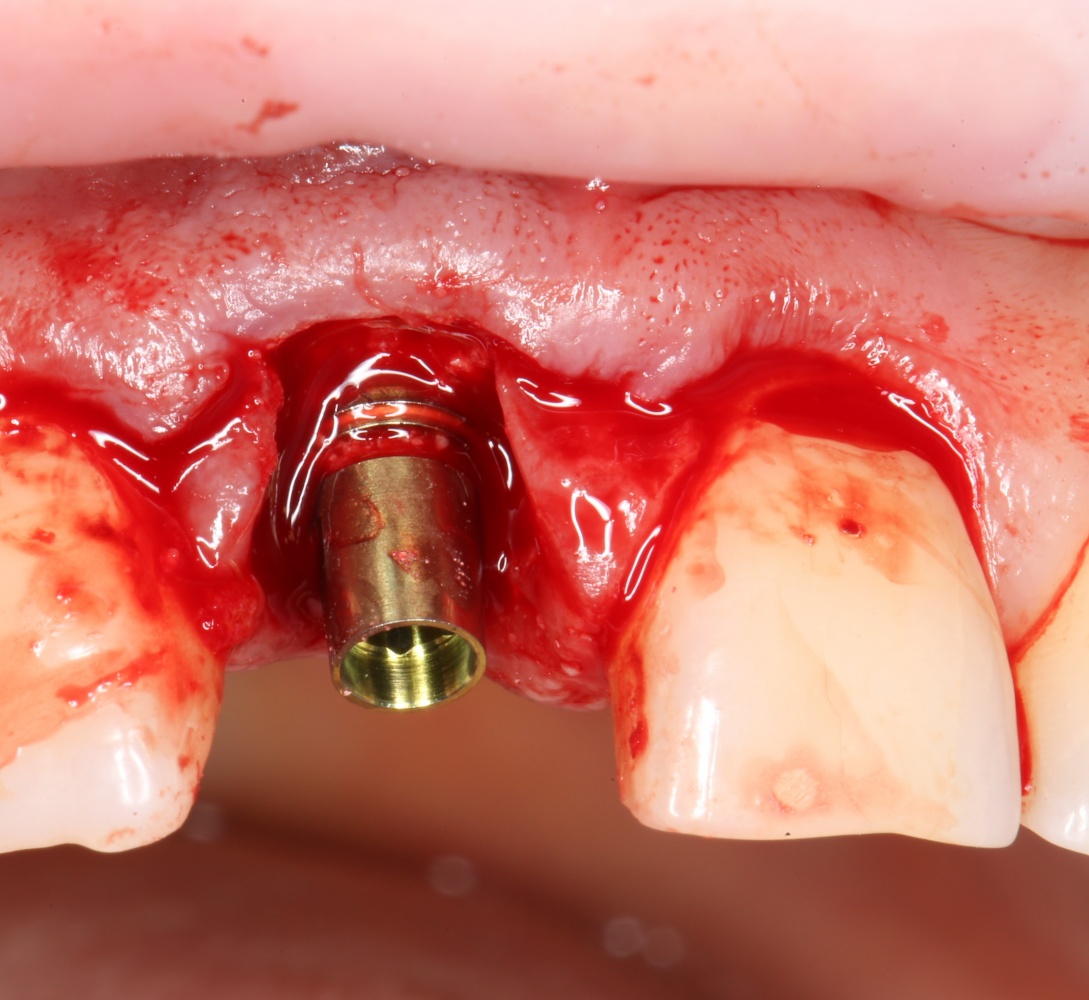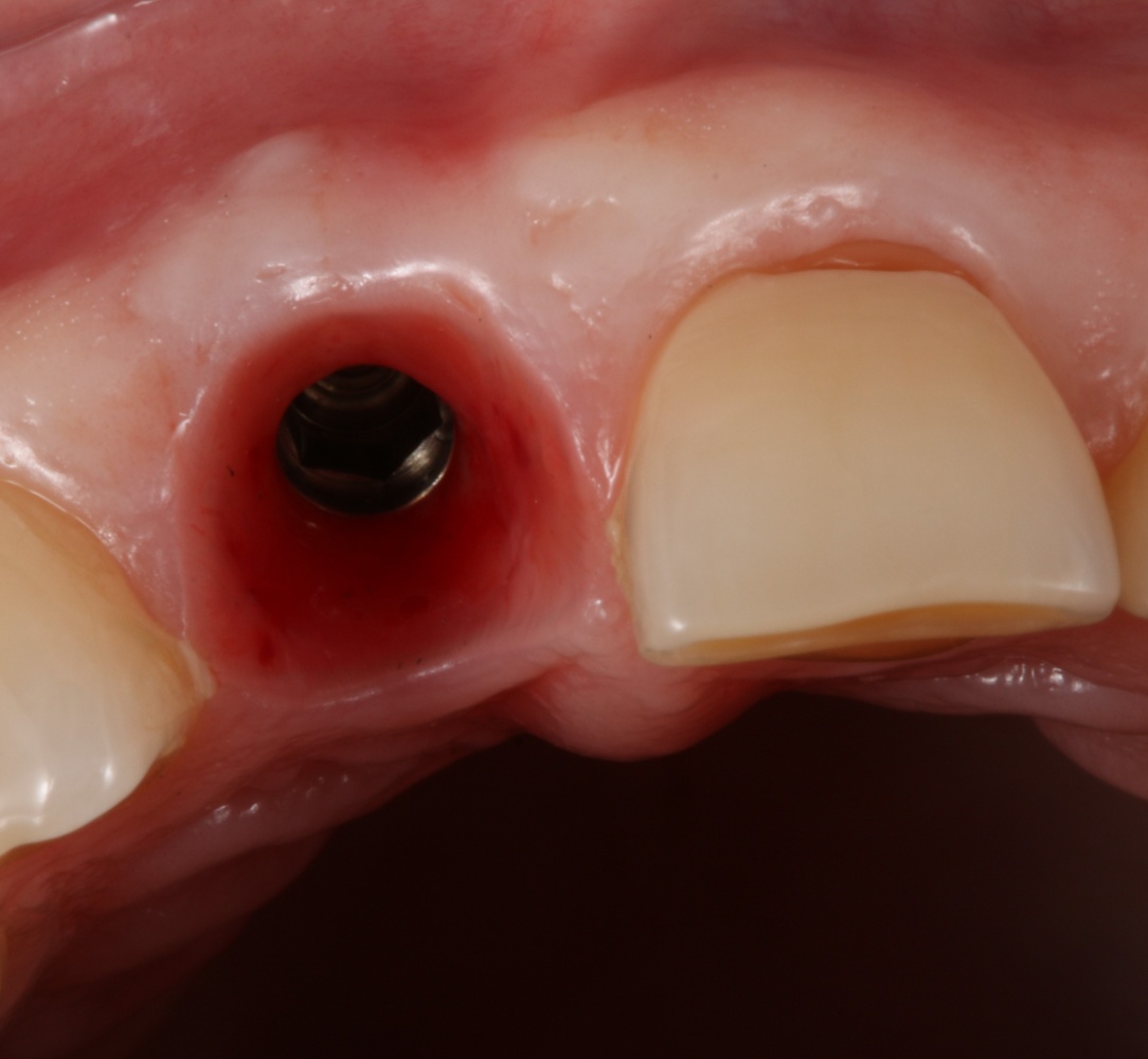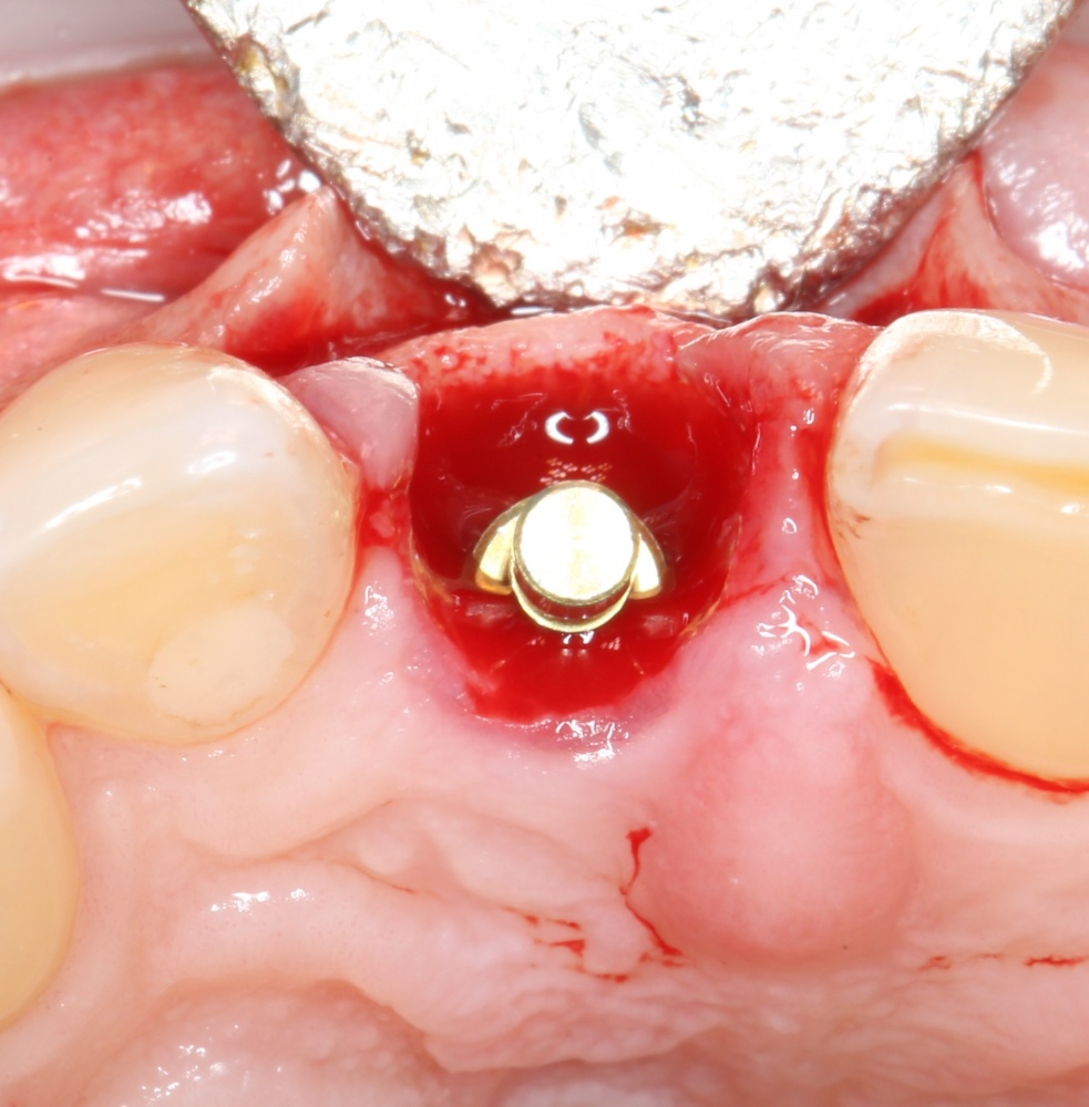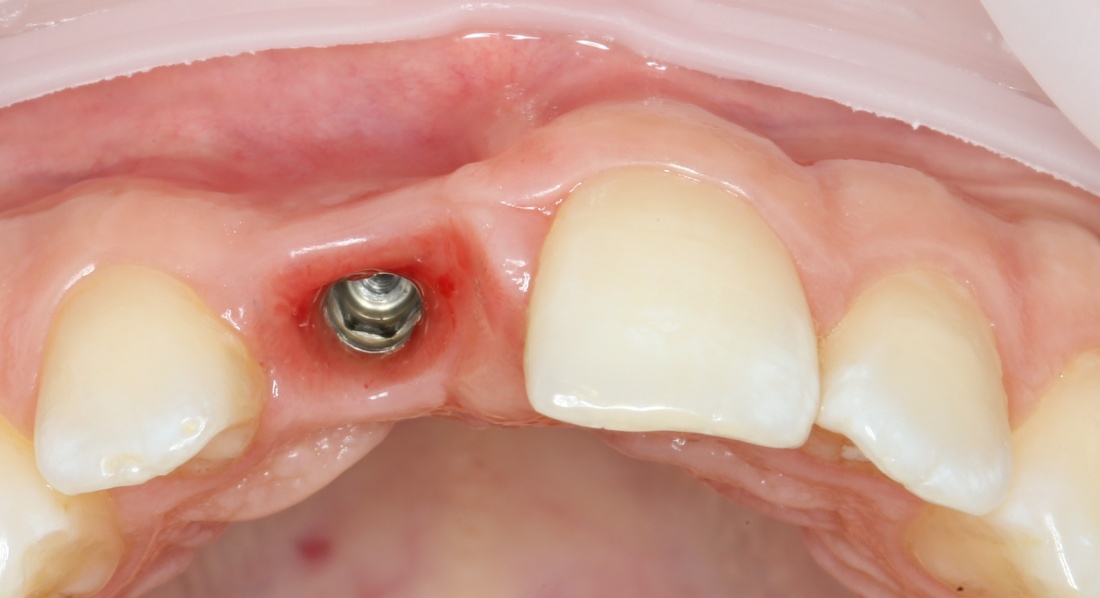 Напомню, что при правильном позиционировании импланта в области фронтальных зубов, он прилегает к небной стенке лунки, а его ось выходит на небную поверхность будущей коронки. В крайнем случае, на режущий край.