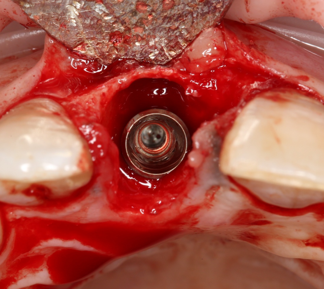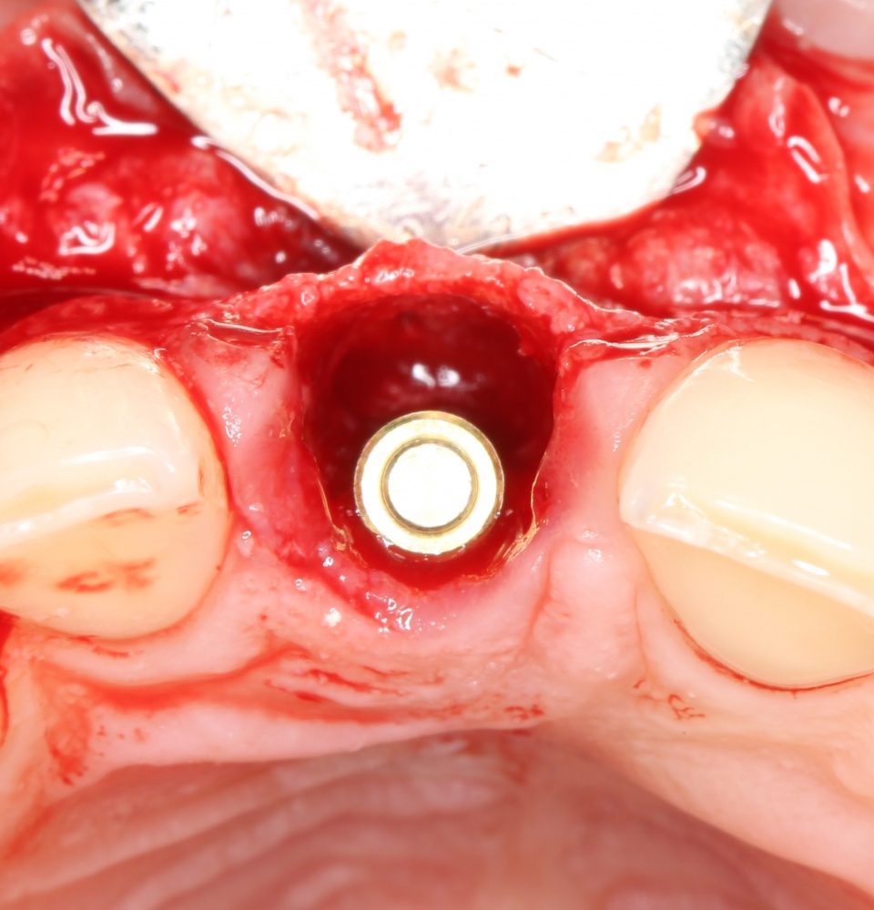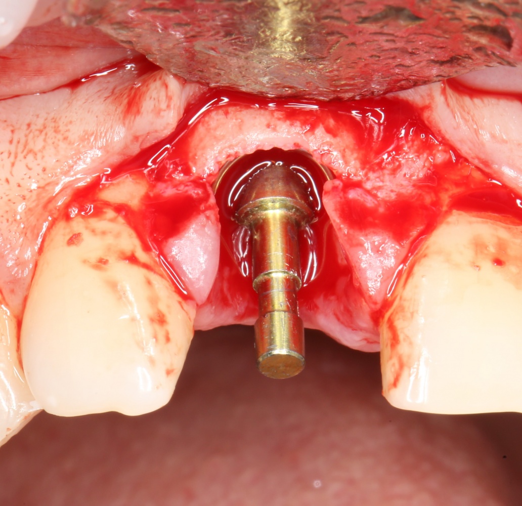 Напомню, что при правильном позиционировании импланта в области фронтальных зубов, он прилегает к небной стенке лунки, а его ось выходит на небную поверхность будущей коронки. В крайнем случае, на режущий край.