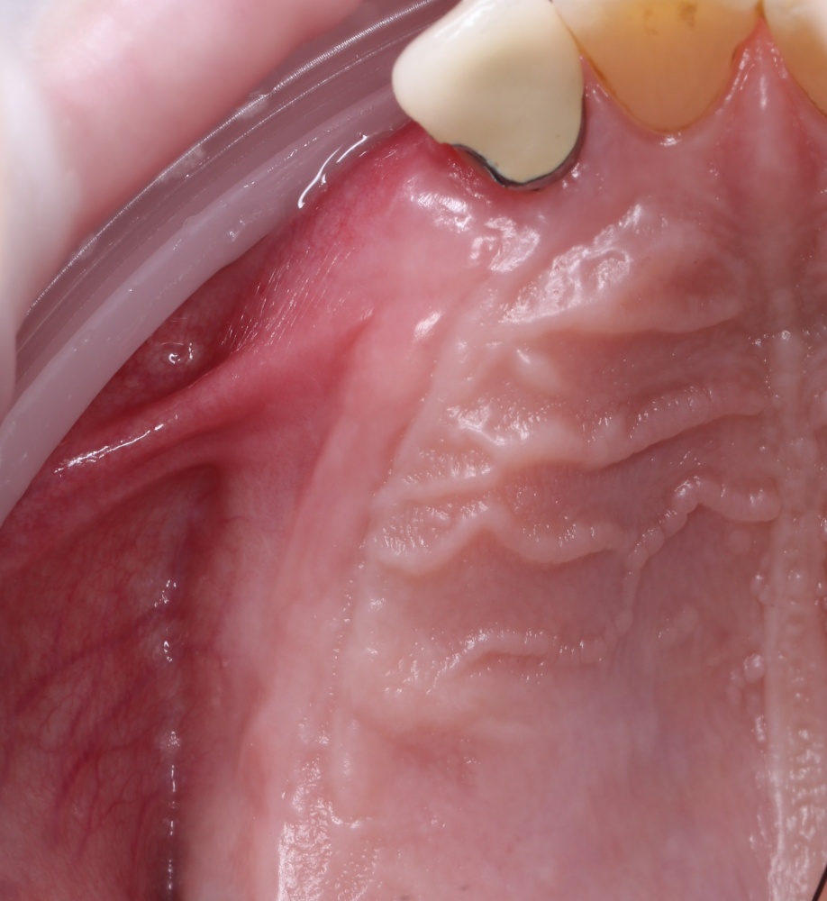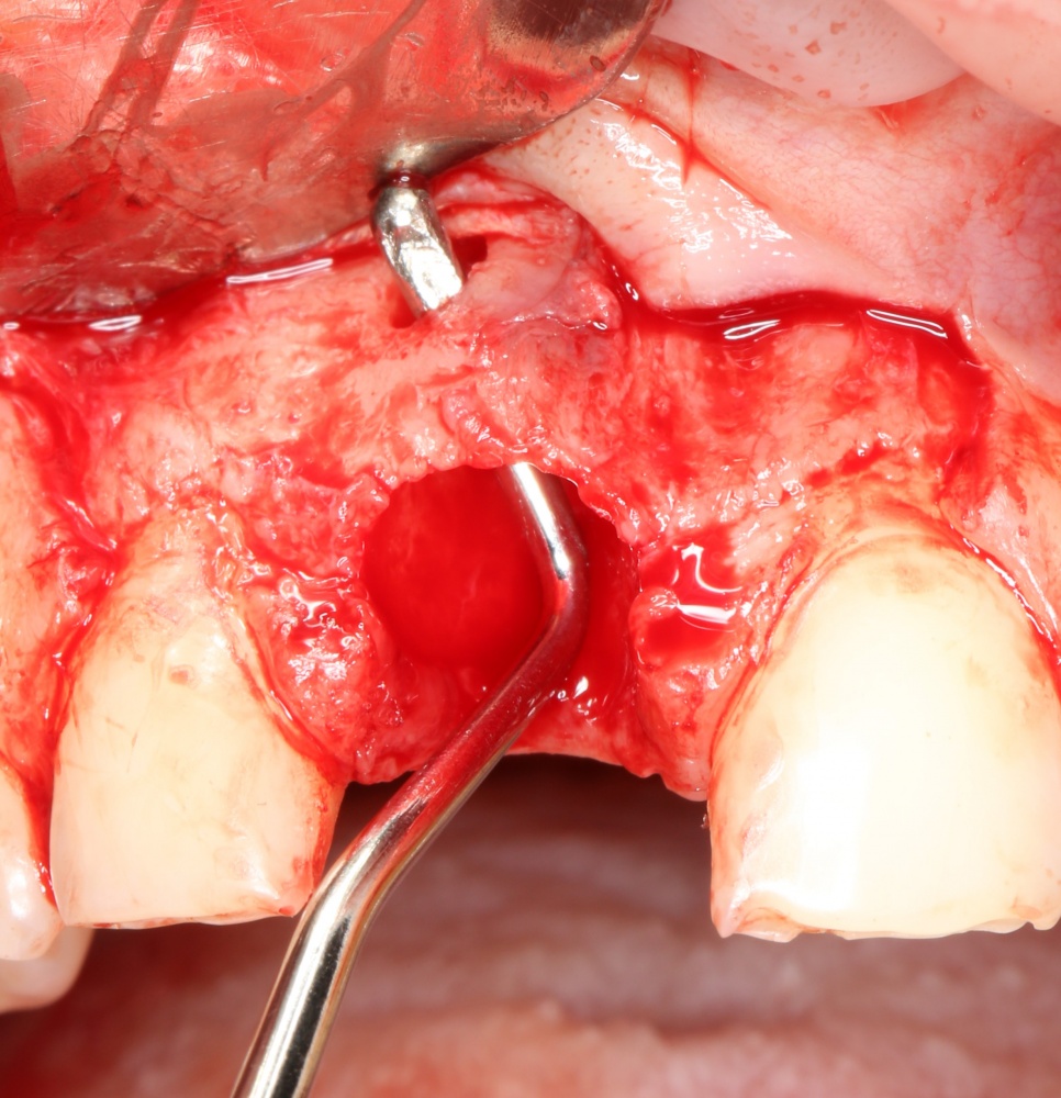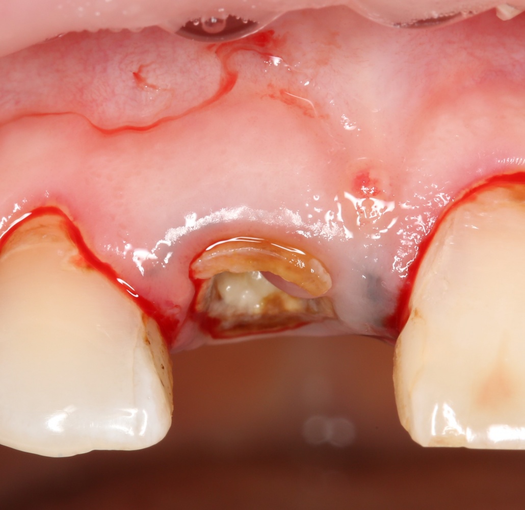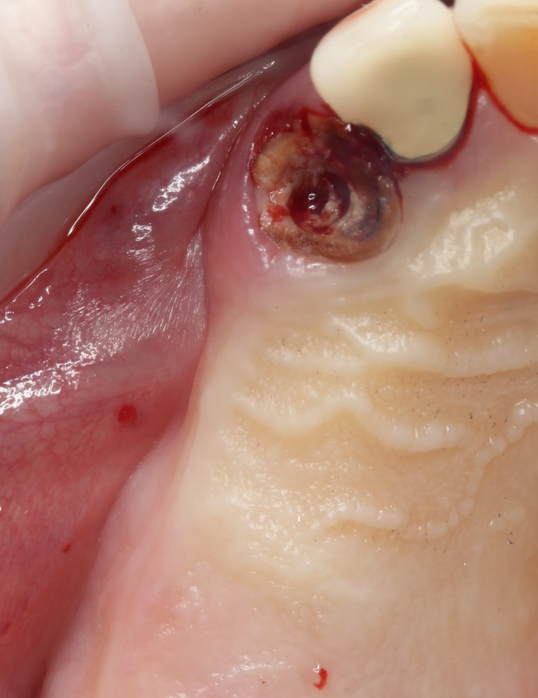Обратите внимание на состояние вестибулярной стенки лунки. В проекции верхушек корней вы можете увидеть костный дефект, вызванный длительным воспалительным процессом (собственно, почему этот зуб пришлось удалять). В этом случае, вестибулярная стенка лунки неизбежно лизируется после удаления зуба, а это приведет не только к проблемам в эстетике, но и осложнит последующий уход за протетической конструкцией. Поэтому в данном случае мы должны продумать, в том числе, аугментацию лунки. И порядок действий здесь несколько иной, нежели в предыдущем случае.