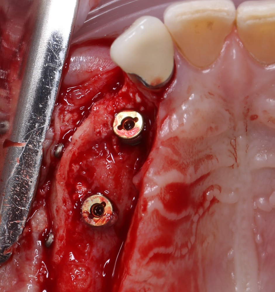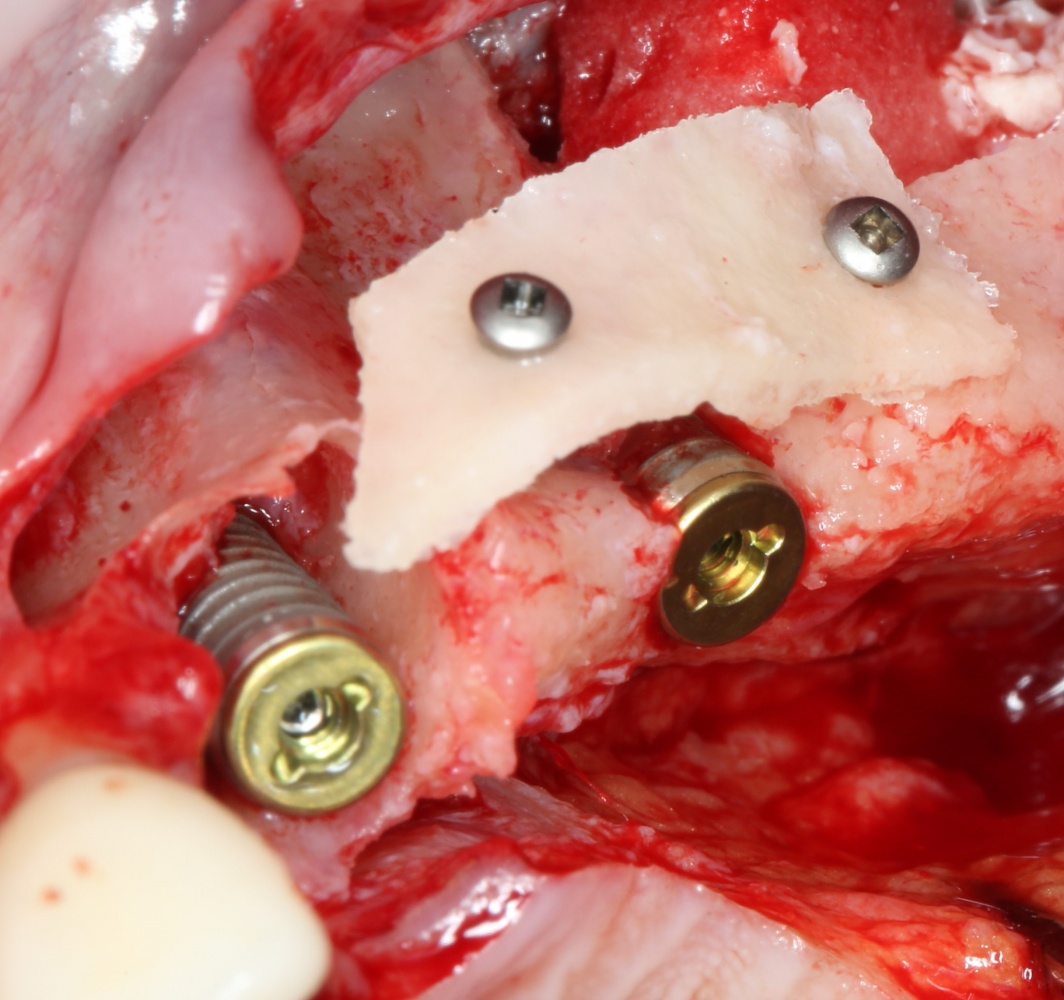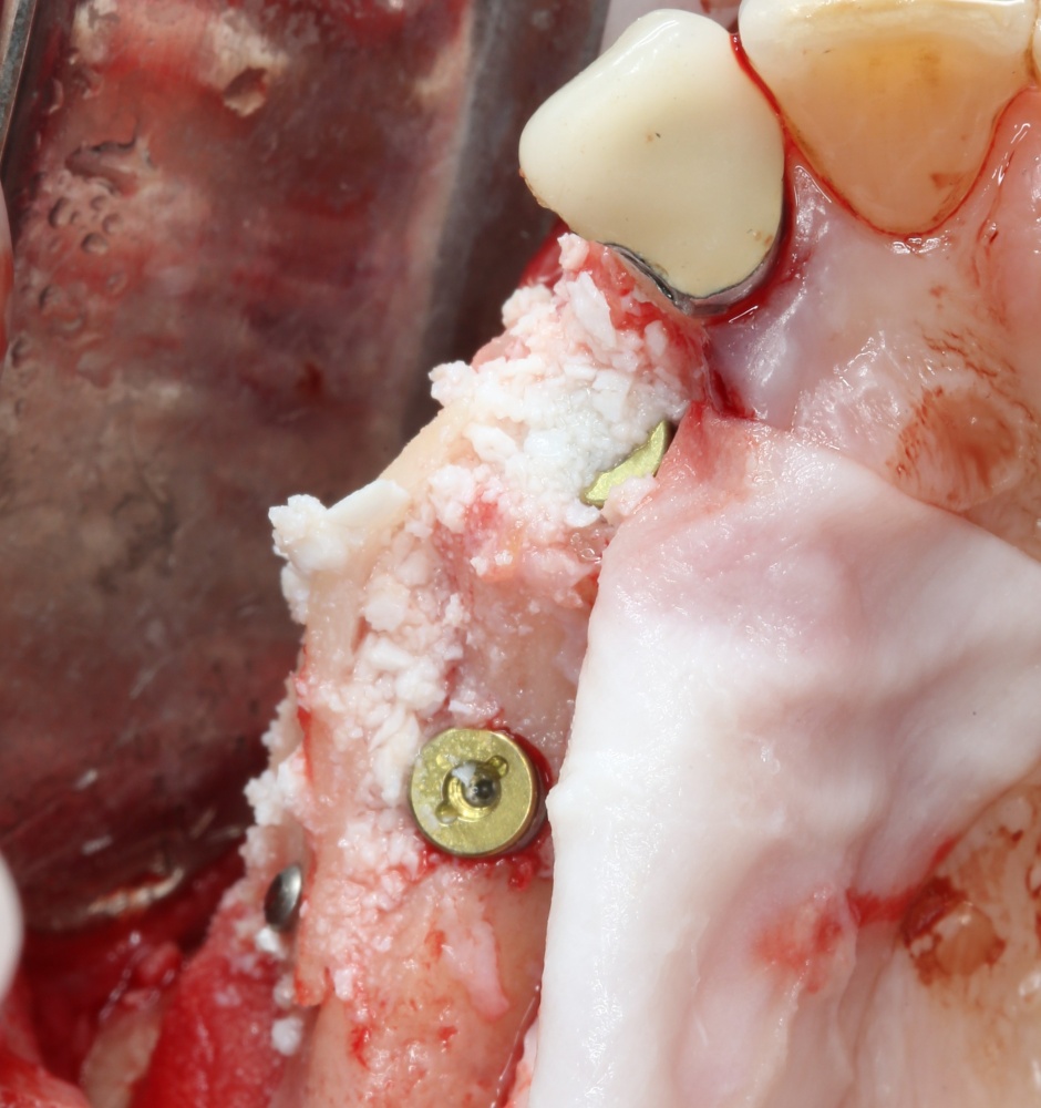 Графт адаптируется (с помощью скальпеля), устанавливается в нужное положение. Для этого, опять же, очень удобно использовать аналоги имплантов из имплантологического набора (в крайнем случае, остеотомы или пины параллельности):