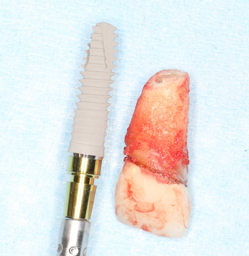 Учитывая то, что имплантат (за редким исключением) всегда меньше, чем удаленный зуб, нам необходимо чем-то заполнить освободившееся от зуба пространство, чтобы удержать окружающие лунку ткани на месте. В противном случае, последующая атрофия может свести на нет эстетические результаты имплантологического лечения: