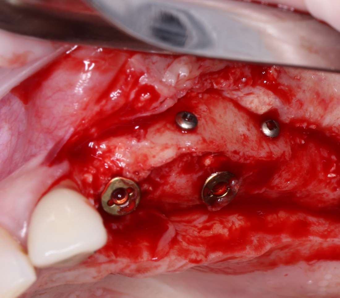 Итак, мы удаляем клык, по шаблону устанавливаем импланты, строим «каркас» будущего альвеолярного гребня в области пятерки: