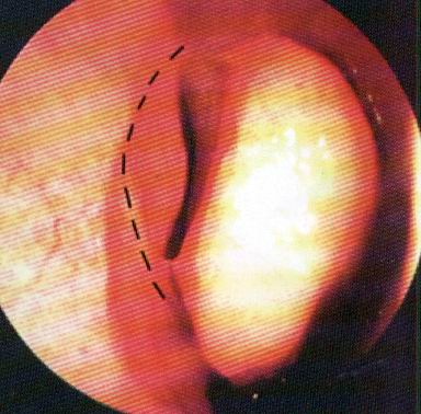 — изучению распределения графта в субантральной полости. Если регенерат не локализован компактно, не имеет чётких границ, то, скорее всего, он инфицирован (была скрытая перфорация) и представляет собой грануляции вперемежку с частицами графта.
