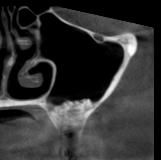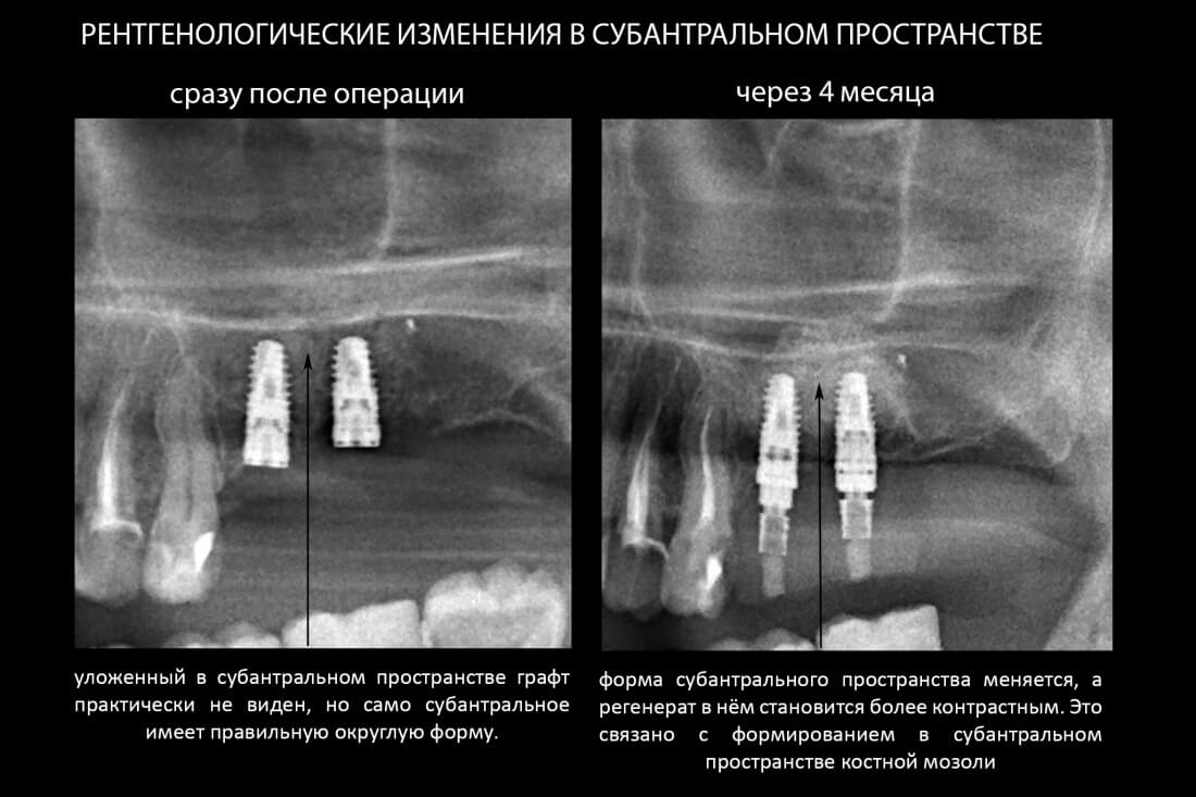 — изучению положения имплантатов в регенерате. Идеальный исход — толщина регенерата над имплантатом составляет от 1 мм и больше. Но, бывает и так, что верхушка импланта, практически, упирается в слизистую оболочку верхнечелюстного синуса. Такое регулярно встречается при использовании коллаген-содержащих графтов, либо при использовании аутокостной стружки в компоненте с графтом — всё из-за значительной усадки.