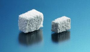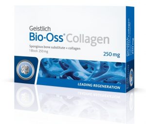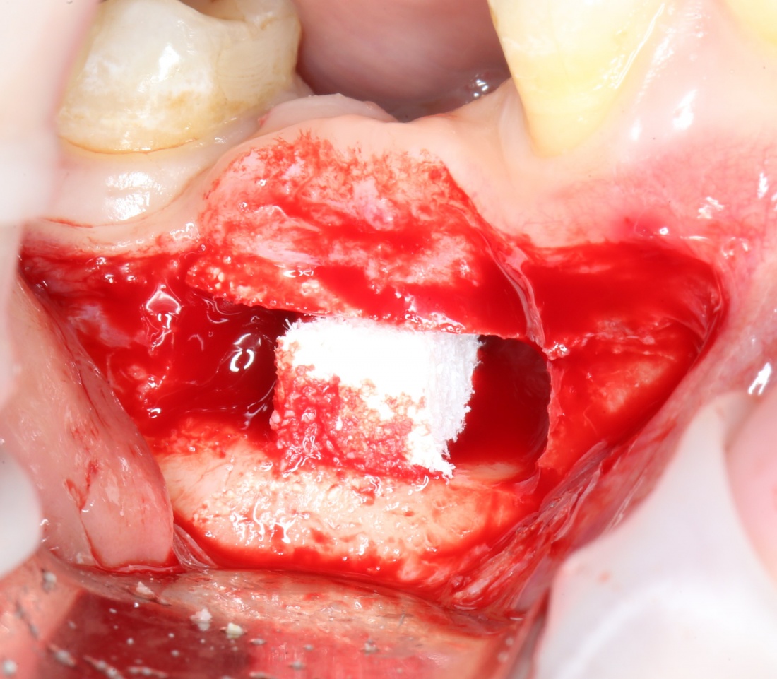 — графт. В основном, мы используем ксенотрансплантаты. Идеальный ксенотрансплантат для таких целей — это выпускающийся в виде твердого кубика, который сам по себе будет служить опорой для перемещенного костного фрагмента. Например, такой как Geistlich Bio-Oss Collagen. Он легко обрабатывается, укладывается и удерживает перемещенный костный фрагмент, но и здесь есть ложка дёгтя — для больших дефектов мало даже большой (250 мг) упаковки Bio-Oss Collagen.