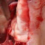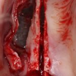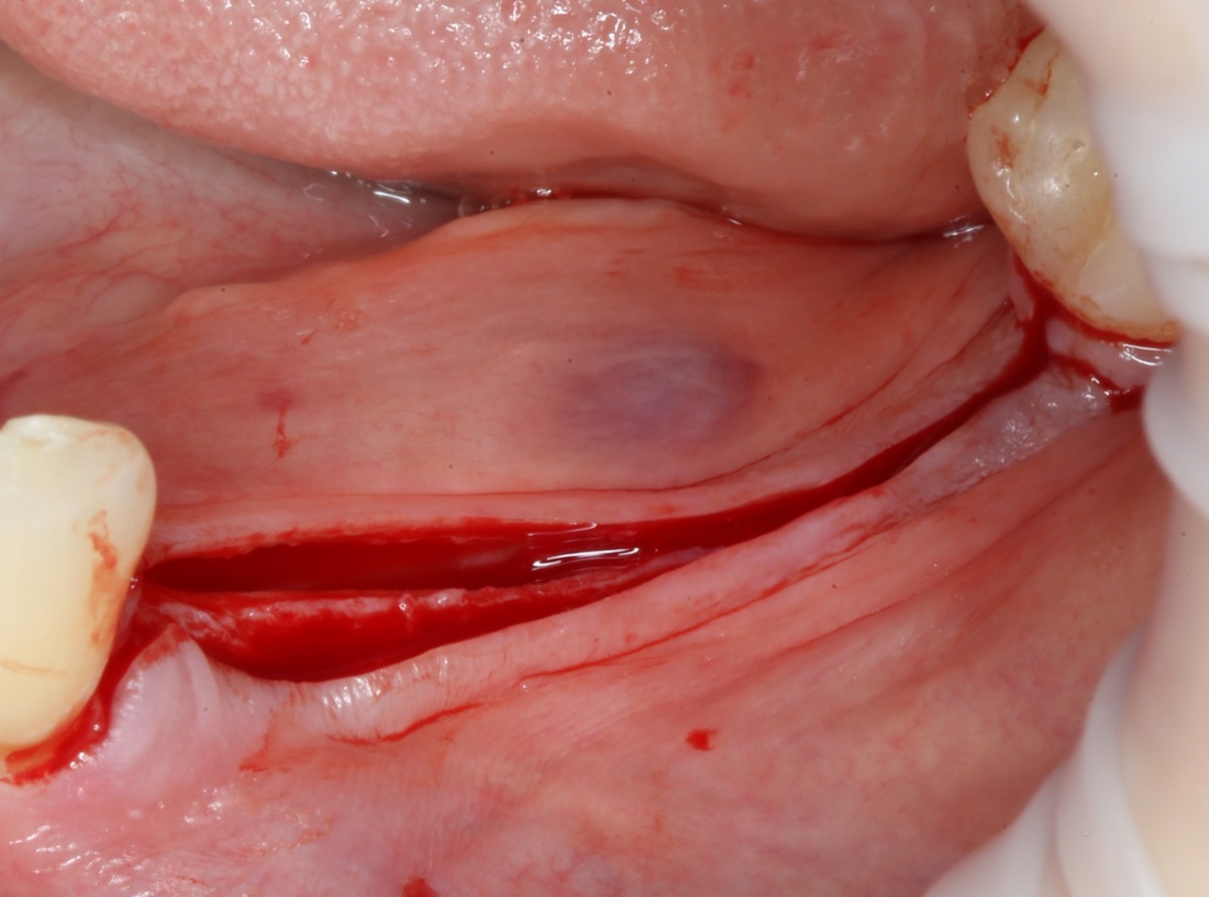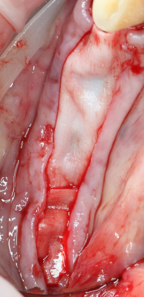 При вертикальной остеотомии (горизонтальной аугментации), наоборот, разрез делается по вершине альвеолярного гребня. При этом, «послабляющие» дополнительные разрезы не нужны.