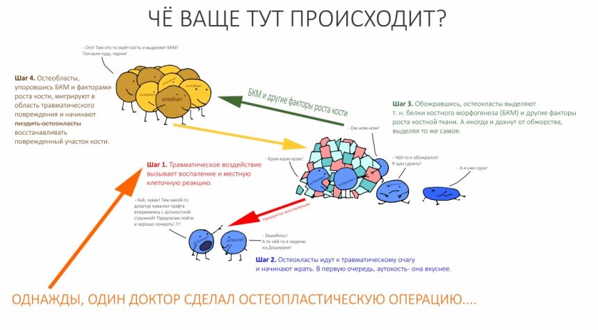В общих же чертах, процесс регенерации кости после остеопластической операции напоминает таковой после перелома. В поврежденном участке активируются макрофагальные клетки, остеокласты и т. д., которые начинают пожирать поврежденные при переломе клетки кости (остеоциты и остеобласты) и межклеточный костный матрикс. Обожравшись, макрофаги распадаются, выделяя т. н. белки костного морфогенеза (БКМ, в буржуйской и пижонской литературе принято английское название BMPs, bone morthogenetic proteins), гормоноподобные вещества, управляющие миграцией и дифференцировкой клеток. Именно БКМ, а это целая группа веществ, управляет не только превращением клеток-предшественников в остеобласты, но и «указывает им путь» и механизм перестройки. Если карикатурно, то этот процесс выглядит следующим образом.