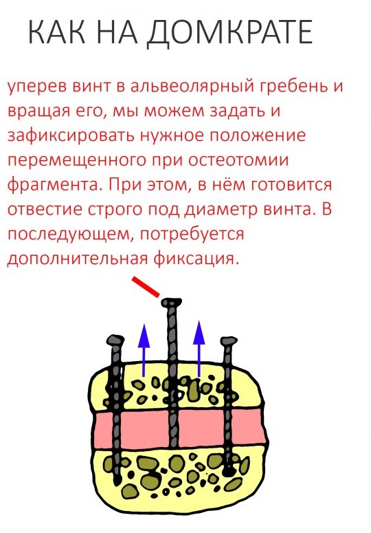 Кроме того, с помощью винтов можно «прецизионно» зафиксировать костный фрагмент, передвигая его как на домкрате: