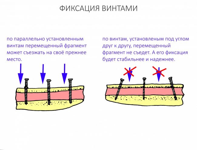 При вертикальной остеотомии очень удобно использовать длинные винты. Так, как указано на схеме.