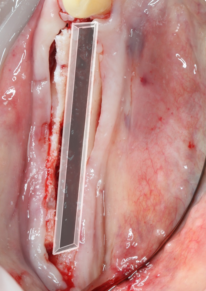 Вы можете самостоятельно посчитать объем графта для того или иного дефекта Для этого нужно вспомнить формулу объема параллелепипеда, образованного стенками костных фрагментов. Например, мы делаем вертикальную аугментацию в области двух зубов, длина дефекта — 2,4 см, средняя ширина альвеолярного гребня на этом протяжении — 1,0 см, высота «подъема» перемещаемого фрагмента — 0,6 мм. Итого, у нас получается: 2,4 х 0,6 х 1,0 = 1,44 куб. см. Это соответствует одной упаковке Geistlich Bio-Oss L 0,5g. И не нужно толкать больше. Чать, не маршрутка в час пик.