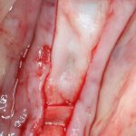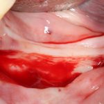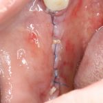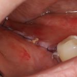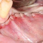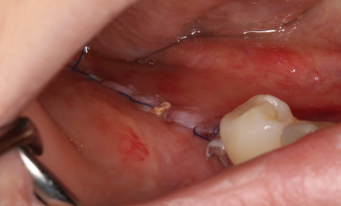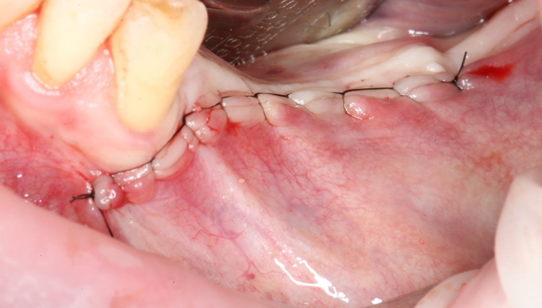 — развивающийся отёк может спровоцировать расхождение швов и инфицирование области операции, несмотря на наличие барьерной мембраны. Лечение: повторное накладывание швов не рекомендуется. Рана ведётся «в открытую» и заживает вторичным натяжением. Нужно пациенту разъяснить важность гигиены полости рта и борьбы с микрофлорой полости рта на этом этапе. Прогноз…. так себе, прогноз. Как правило, мы теряем результат в 40% случаев.