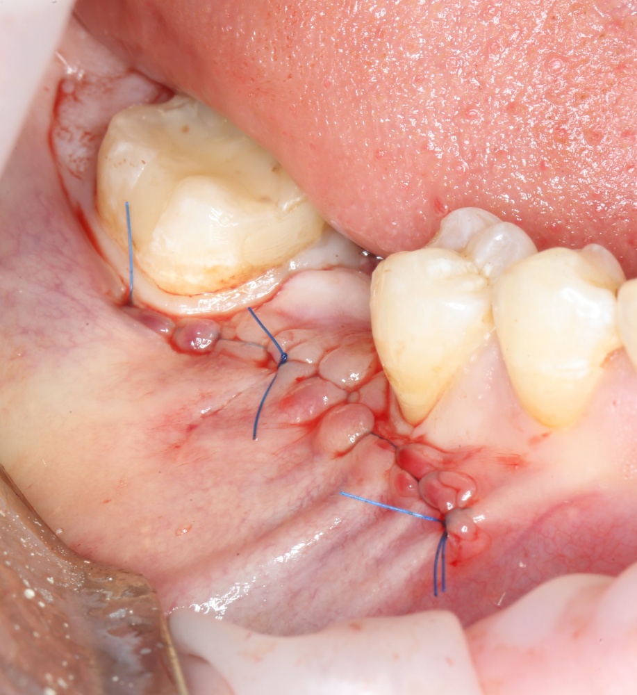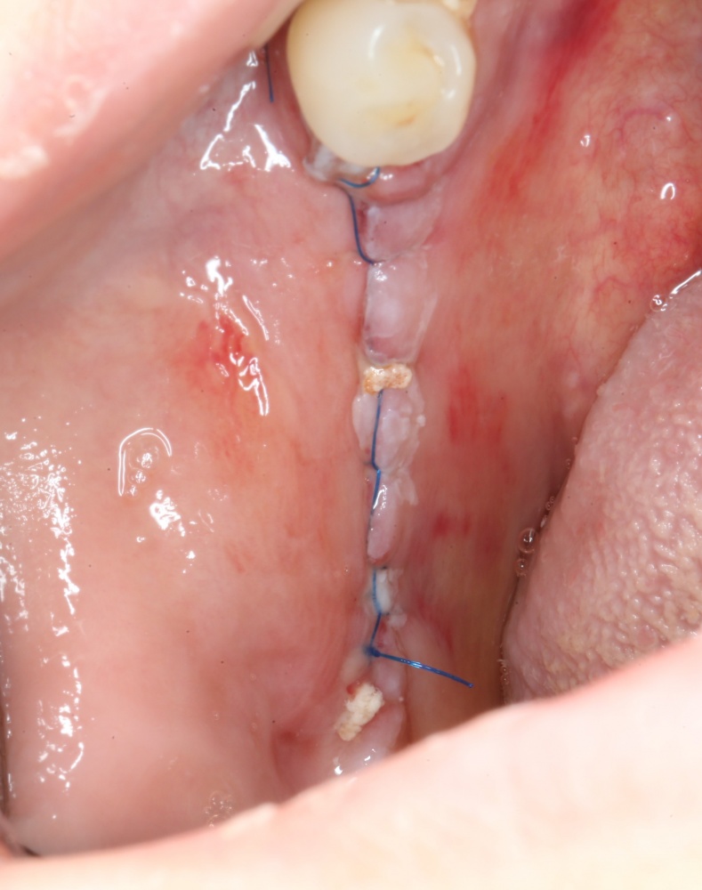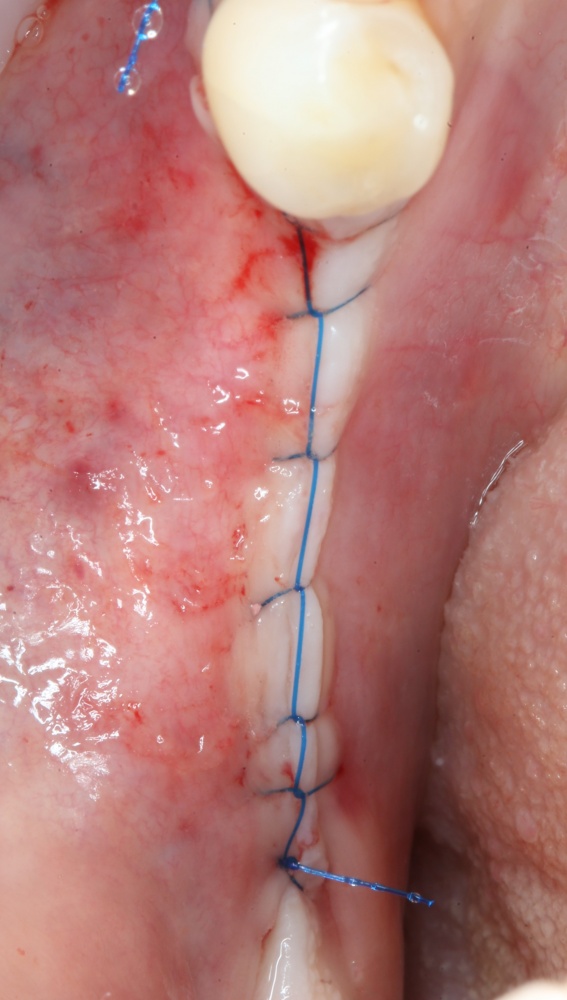 Я ни разу не испытывал каких-то проблем с ушиванием операционной раны. Как правило, её края сходятся достаточно легко без дополнительной периостотомии. Для наложения швов мы используем монофиламентные нерезорбируемые нити диаметром 5-0 (Resolone, Prolene, Полипропилен и др.).