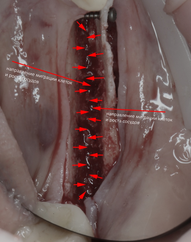 В-третьих, достаточно большая раневая поверхность «привлекает» большее количество макрофагов, следовательно, мы имеем больше БКМ, факторов роста, управляющих регенерацией кости. Уточню — без добавления аутокостной стружки или чего-то там искусственного: