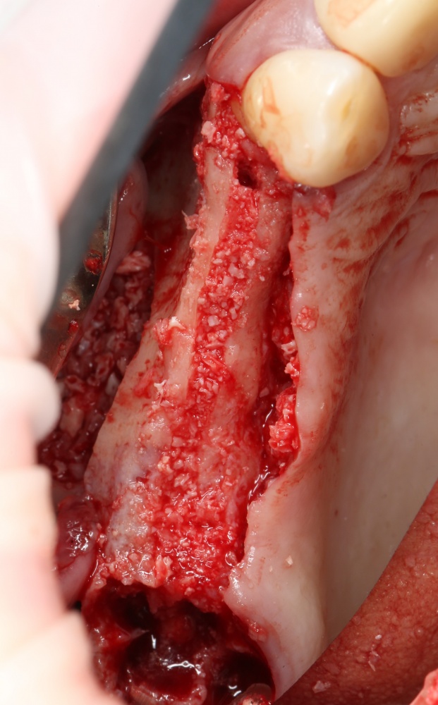3. Этот пункт, как ни странно, решается еще проще. Фактически, после остеотомии мы получаем «перелом» и весьма большую раневую поверхность. Чаще всего, этого оказывается достаточно для запуска процесса регенерации без аутокостной стружки и каких-то дополнительных БКМ.