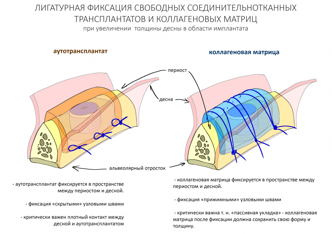 Есть существенная разница в способах фиксации ССТ и коллагеновой матрицы. Так, последняя фиксируется к поверхности с помощью прижимных швов, в то время как десневой аутотрансплантат просто подшивается к слизистой оболочке: