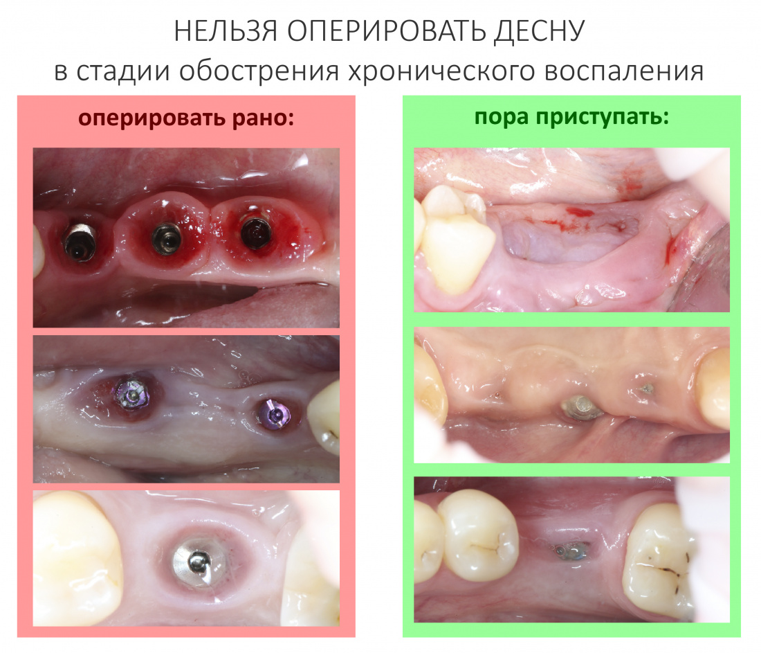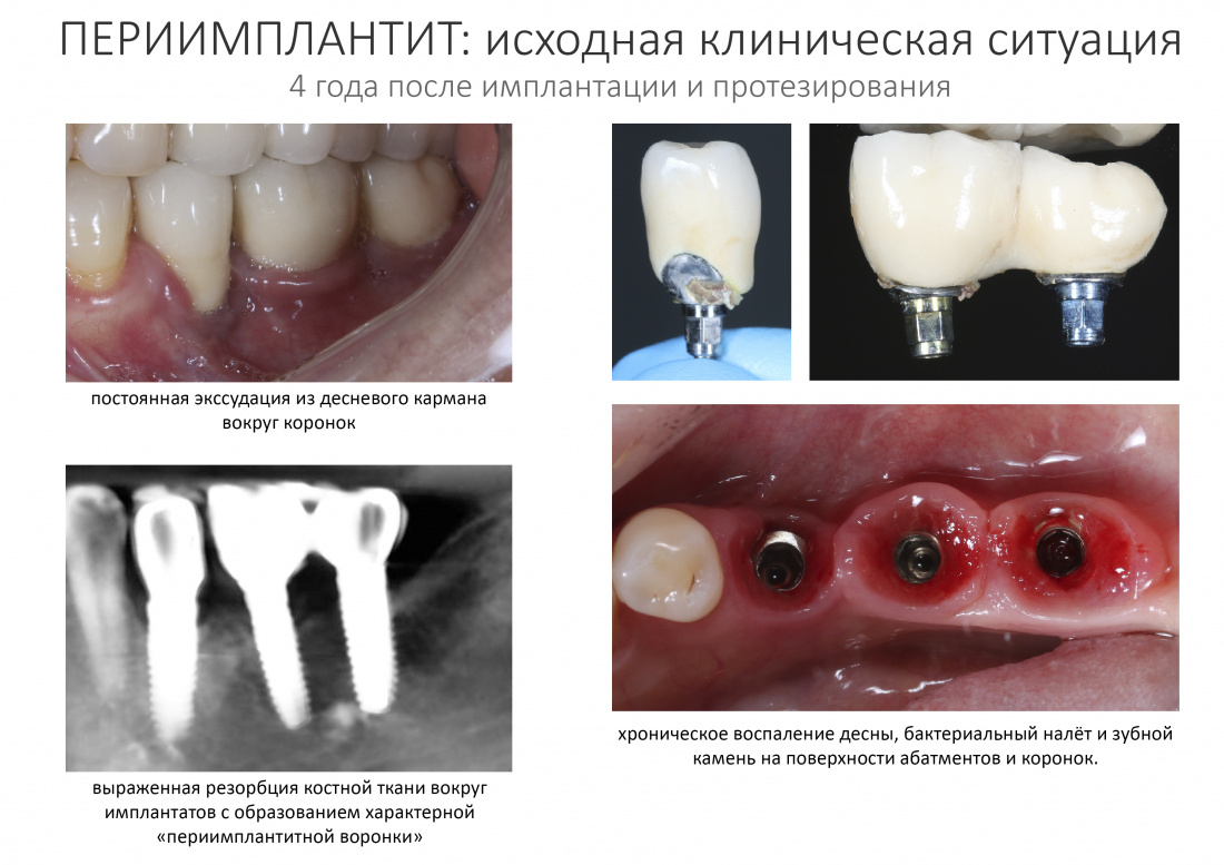 На этом этапе многие доктора делают серьёзную ошибку, пытаясь восстановить костную ткань вокруг имплантата посредством костной аугментации с использованием биоматериалов и т. д. Признаюсь, я не видел НИ ОДНОГО случая, где подобный подход был оправдан и привёл к положительному результату — в лучшем случае, ничего не происходит и ничего нового не вырастает, в худшем — ситуация усугубляется и приводит к утрате имплантата. И, тем не менее, подобное «лечение периимплантита» продолжает оставаться популярным, по причине очень слабых знаний патофизиологии и патоанатомии хронического воспаления у большинства стоматологов.