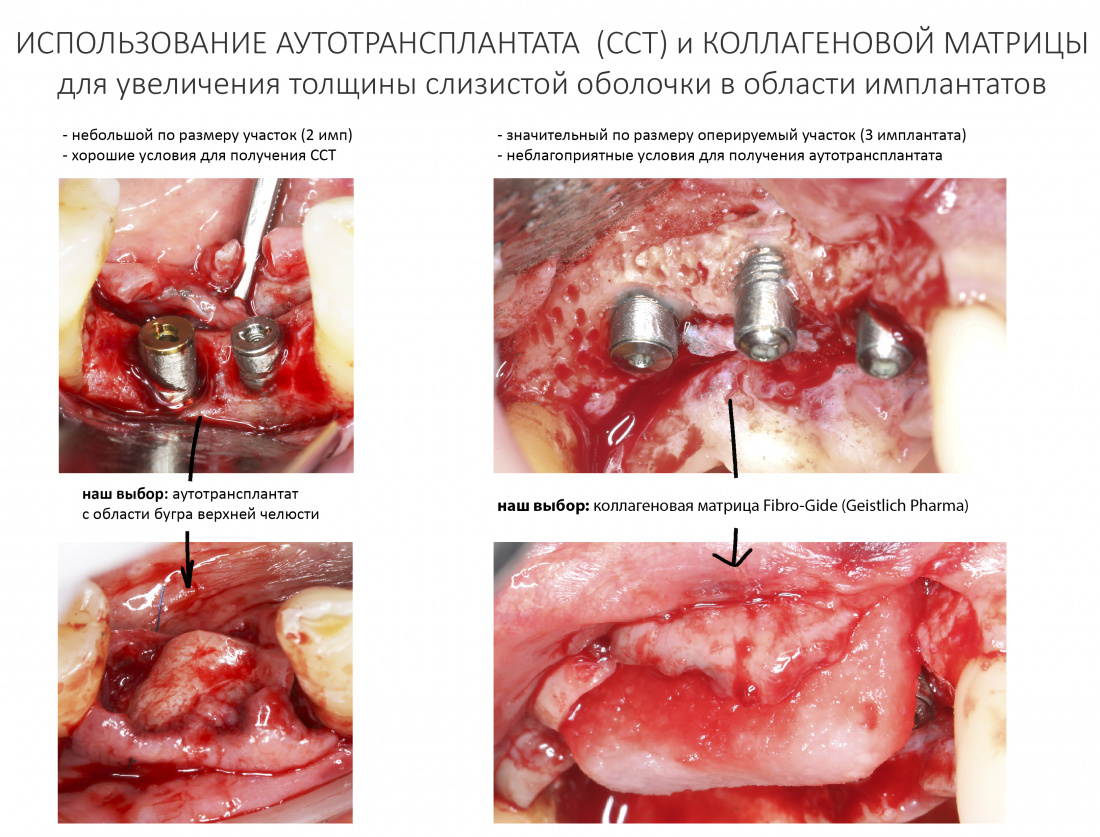 Например, при работе в области одиночного имплантата и наличии хороших донорских зон, разумно использовать свободный соединительнотканный трансплантат. И наоборот, в ситуации, когда получение аутотрансплантата достаточной площади представляет сложности (например, тонкий биотип слизистой в донорских участках, значительная по размеру область операции) — мы обычно используем коллагеновую матрицу Fibro-Gide: