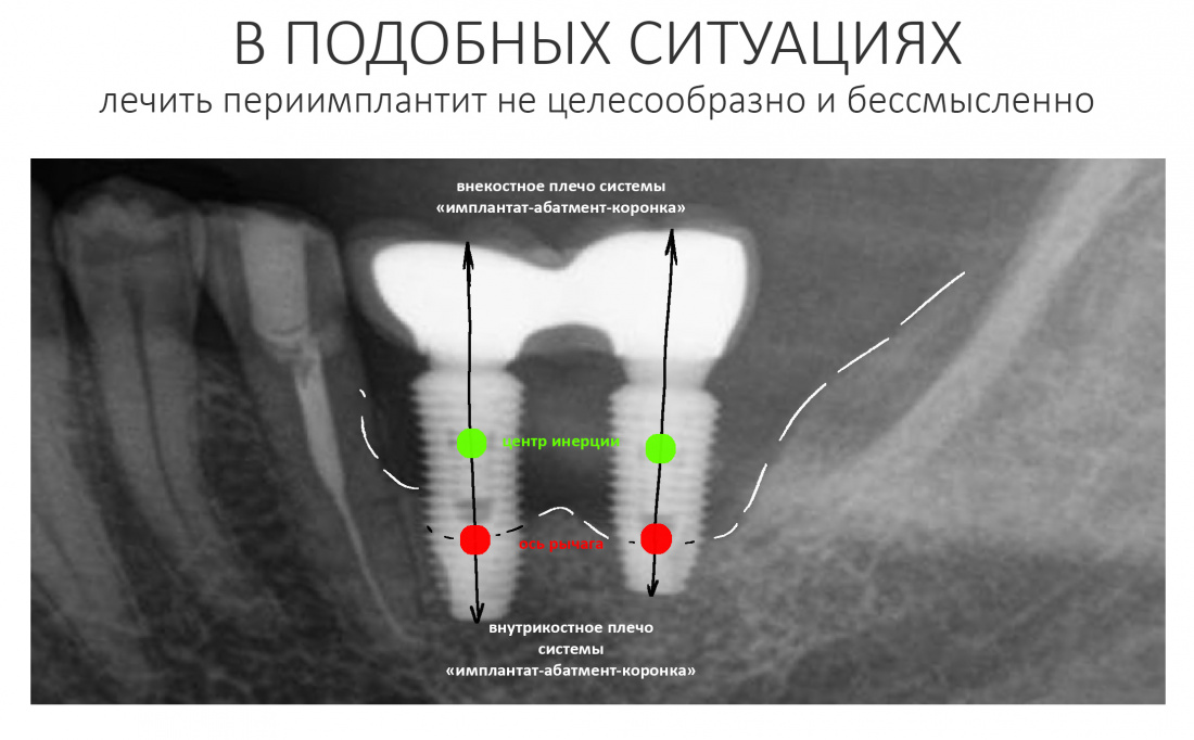 Например, утрата костной ткани на 2/3 длины имплантата приводит к тому, что его центр инерции перемещается слишком далеко от опорной кости, а в таких условиях любая более-менее значительная нагрузка приведёт к вывиху или перелому имплантата. Как, например, на картинке ниже — внекостное плечо системы «имплантат-абатмент-коронка» существенно превышает внутрикостное, из-за чего нагрузка на окружающую имплантат кость значительно (в два раза, если быть точным) возрастает, а надежность конструкции падает.
