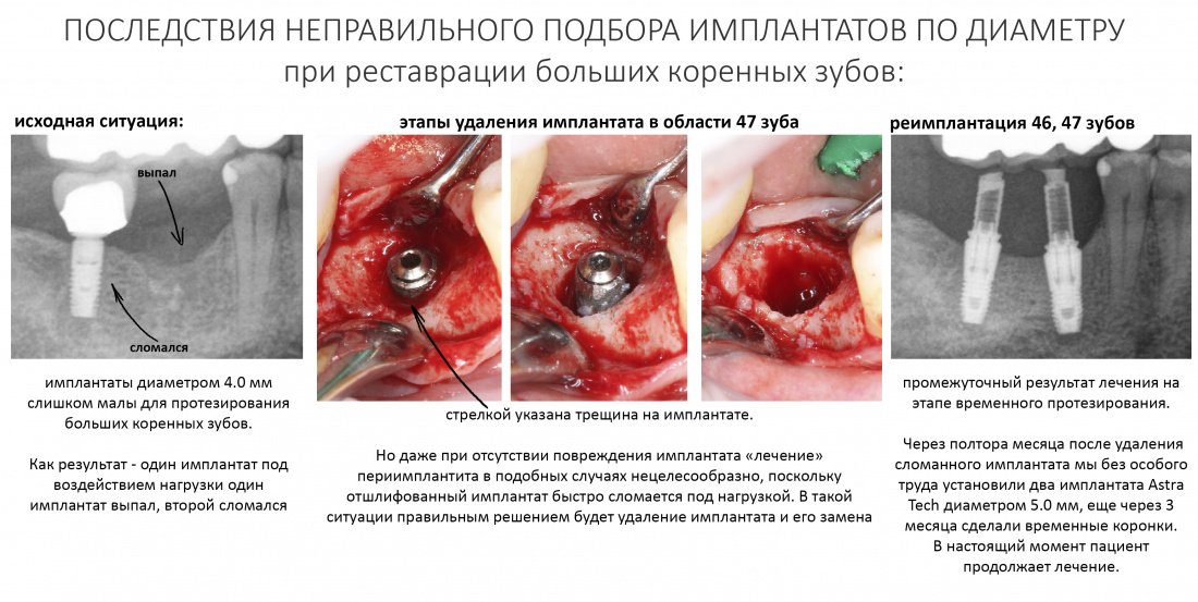 Добавлю одну ремарку. Я много раз писал о важности правильного подбора и позиционирования имплантата, о соблюдении хирургического протокола, о необходимости ограничивать крутящий момент при установке имплантата и т. д. Так вот, имплантаты диаметром менее 4,0 мм имеют тонкие боковые стенки, шлифовка серьёзно их ослабляет, а последующая нагрузка может привести к перелому имплантата. О судьбе и целесообразности спасения подобных имплантатов, установленных в области больших коренных зубов, стоит очень серьёзно подумать — может быть, сразу заменить их на нормальные?