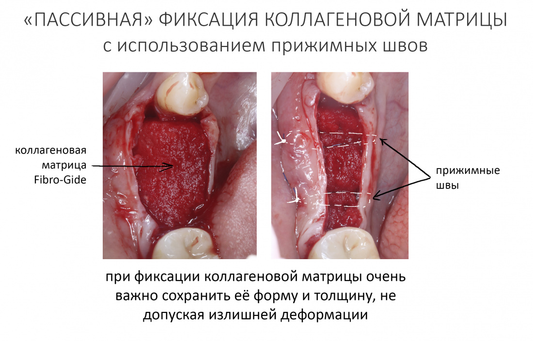 Кроме того, вопреки расхожему мнению, она существенно (примерно в два раза) уменьшается в толщине, а потому я рекомендую ни в коем случае её не делить, не уменьшать толщину. Другой особенностью является т. н. «пассивная укладка» — коллагеновую матрицу нельзя сжимать, а в процессе фиксации нужно стремиться к тому, чтобы она сохранила свою форму и толщину.