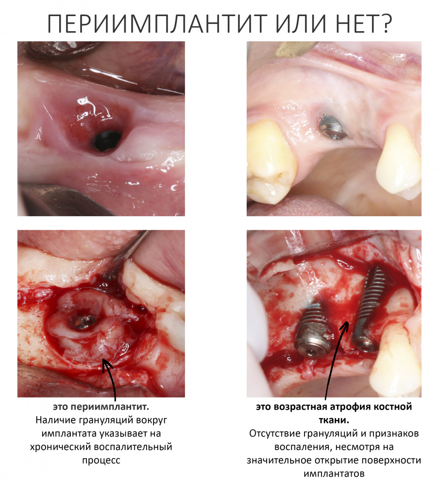 Еще стоит добавить, что исправить ситуацию, вызванную не воспалительной атрофией костной ткани вокруг имплантатов (как на правой картинке выше), намного сложнее, чем «победить» периимплантит. Об этом мы поговорим в одной из предстоящих публикаций.