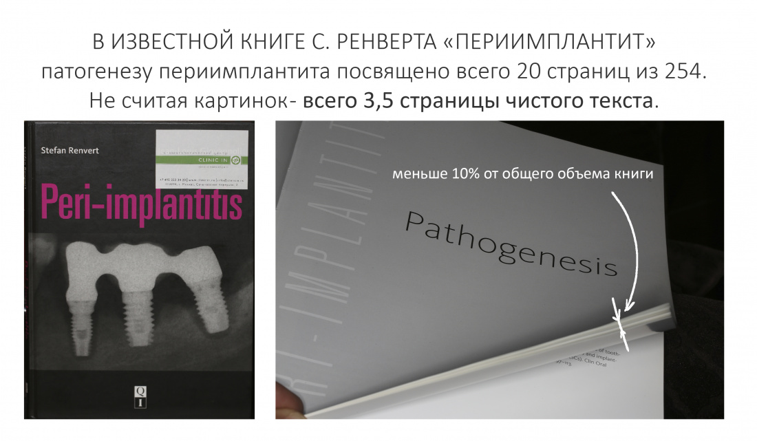 — отсутствие вменяемых исследователей периимплантита. Тот же Стефан Ренверт, «общепризнанный авторитет» в области изучения перимплантита, посещение лекции которого стоит дороже, чем билет на концерт Элтона Джона, в своей книге «Периимплантит» за 16 тыщ рублей уделил причинам периимплантита всего 20 страниц, из которых чистого текста — всего три с половиной страницы. И таких «авторитетов» масса, все они, конечно же, умеют лечить периимплантит, но ничего не знают о его причинах.