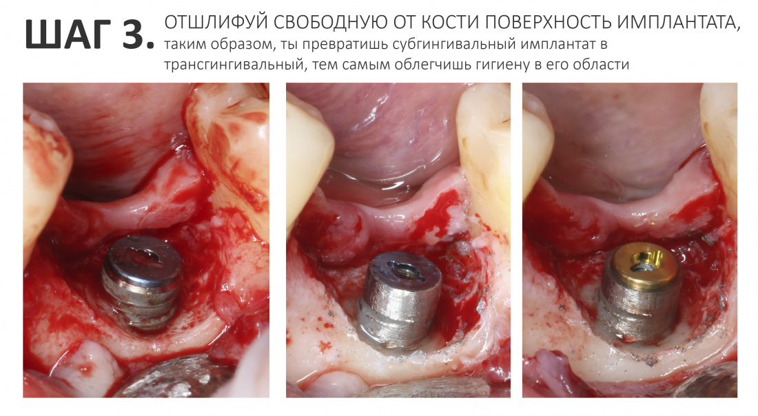 Следом, с помощью мелкозернистого (финишного) алмазного бора, убери образовавшиеся заусеницы. Таким образом, ты превратишь субгингивальный имплантат в трансгингивальный и дашь ему второй шанс на долгую и счастливую жизнь.