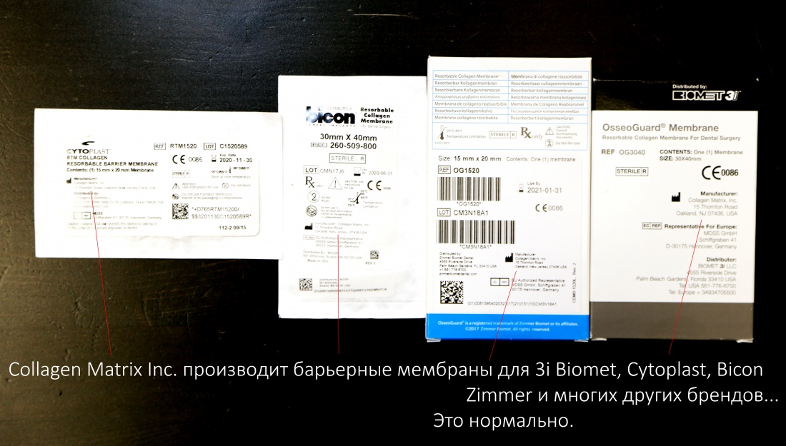 Замечу кстати, что производителей коллагеновых материалов в мире не так много — всего 4-5 фабрик, включая известную вам Geistlich Pharma. Большинство компаний, например Collagen Matrix, обслуживает пять-шесть брендов: