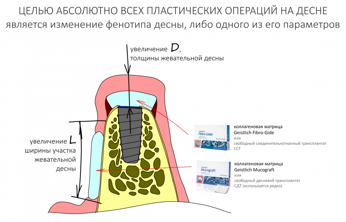 — коррекция биотипа десны после ранее проведённой остеопластики и/или имплантации