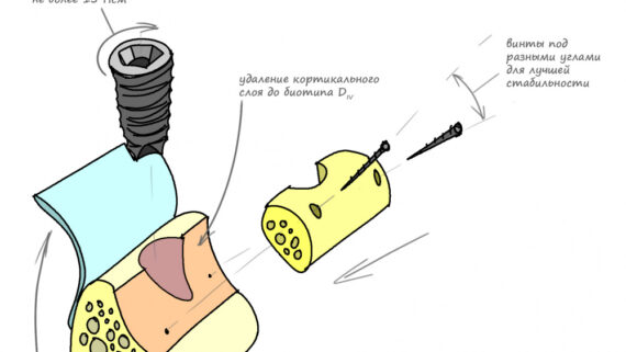 — периост отслаиваем от поверхности кости как можно меньше, только в пределах имплантатов и периимплантитной «воронки».