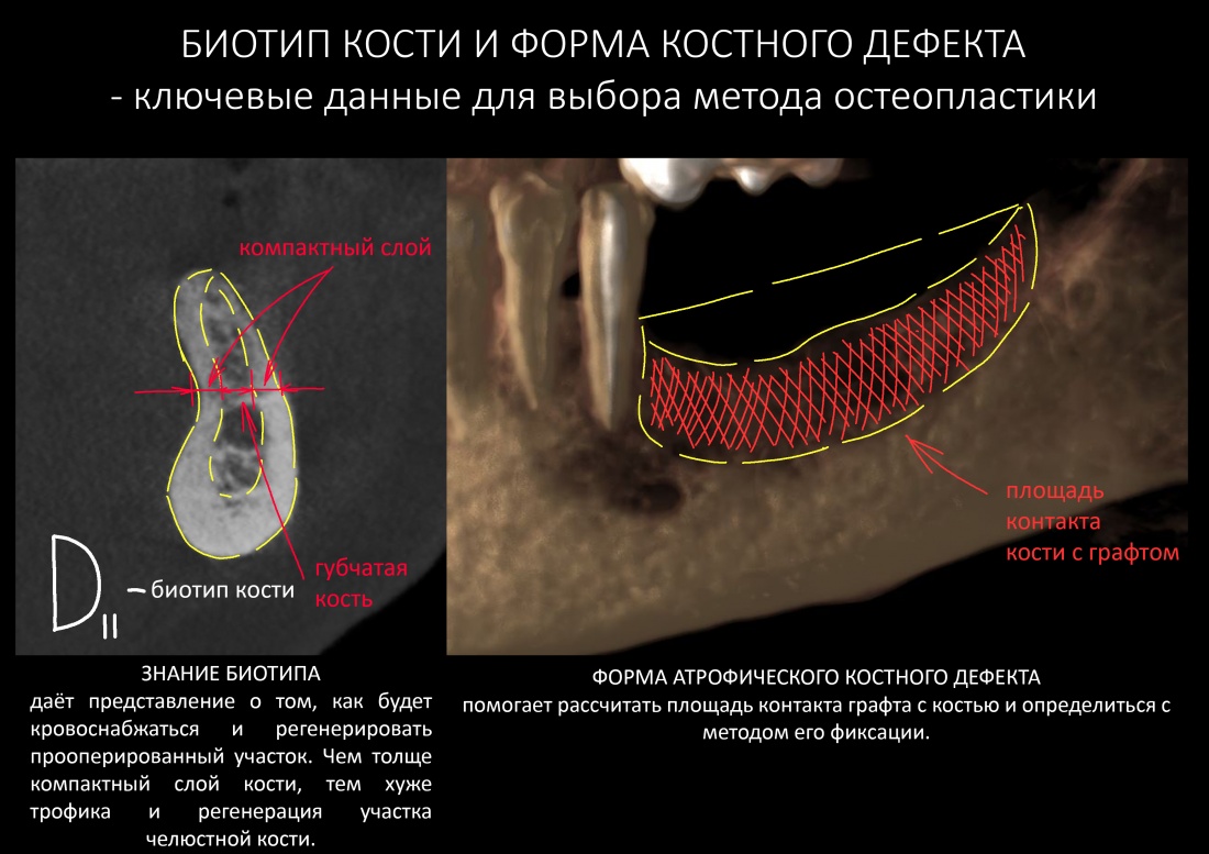 Я неоднократно повторял этот тезис в последующих публикациях и писал о том, что направленная костная регенерация в области челюсти с биотипом D1 практически обречена. Особенно, если речь идёт о костных дефектах с малой относительной площадью поверхности. Почитать об этом можно, например, здесь>>