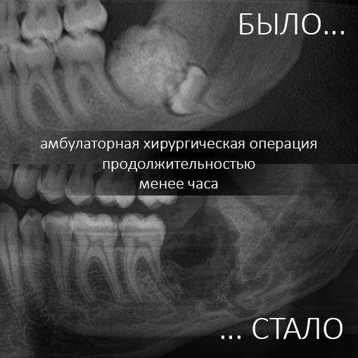 Всё просто. На верхней картинке — клиническая картина до операции. На нижней картинке — результат после амбулаторной хирургической операции, продолжительностью менее одного часа. Опухоль удалена и отправлена на гистологическое исследование, зуб удалён и подарен пациенту, а все остальные сделали правильные выводы из этой истории…
